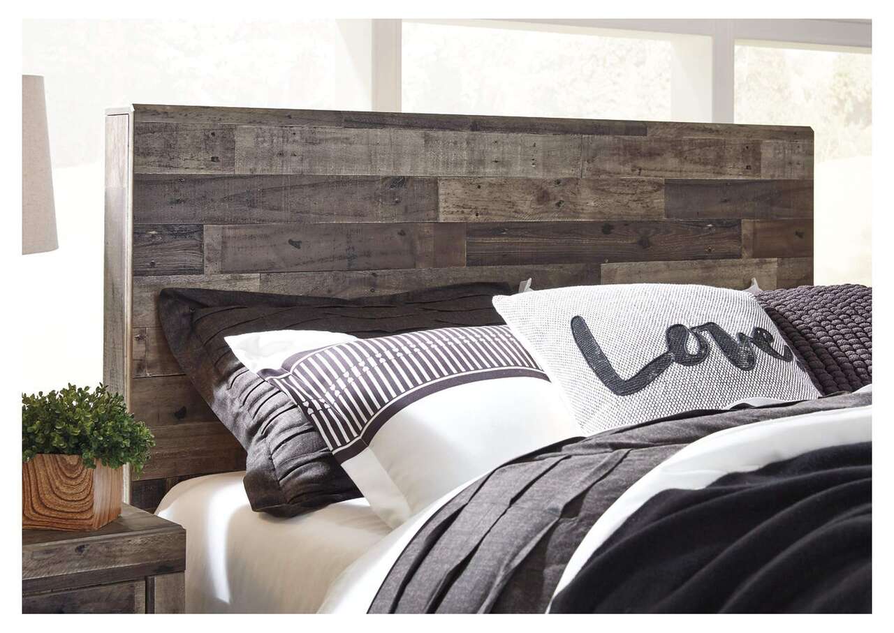 Modern yet hefty. This king panel bed makes an urban eclectic statement. Seasoned raw wood look merges with the clean lined design we love today. Muted rustic finish over replicated pine grain maintains its authenticity for a beauteous look. Mattress and foundation/box spring available, sold separately. Includes headboard, footboard and rails