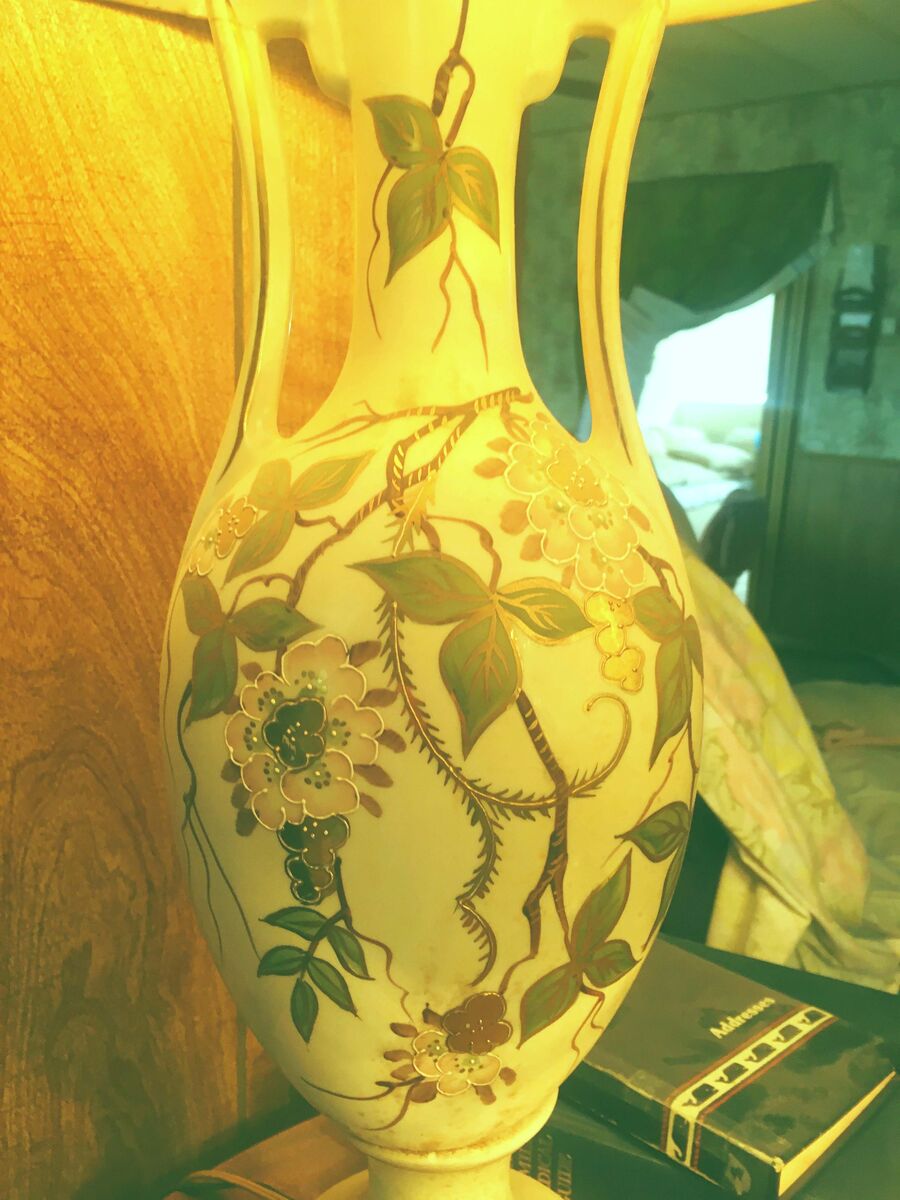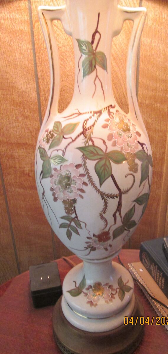 21" base x 38" high (including shade) x6" brass base antique white lamp w/hand painted flower clusters and handle has been repaired, silk shade (has a few tears due to age). Item is located in Salina, UT. Please call: (435)529-3424 or email: jilenev55@gmail.com to make arrangements to see if interested.