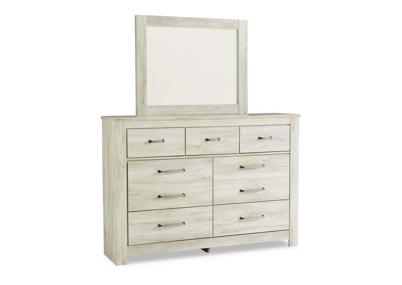 Your bedroom isn’t just a room. It’s a canvas. Express your farmhouse style with the Bellaby dresser and mirror set. Wispy white finish over replicated oak wood grain brightens up the space with charm. Brushed nickel-tone handles with black edging finesse the piece with a bit of shine. Drawers are spacious and lined with faux linen laminate to hold your belongings with care. This clean-lined profile is the perfect authentic foundation for inviting decor.Includes dresser and mirror