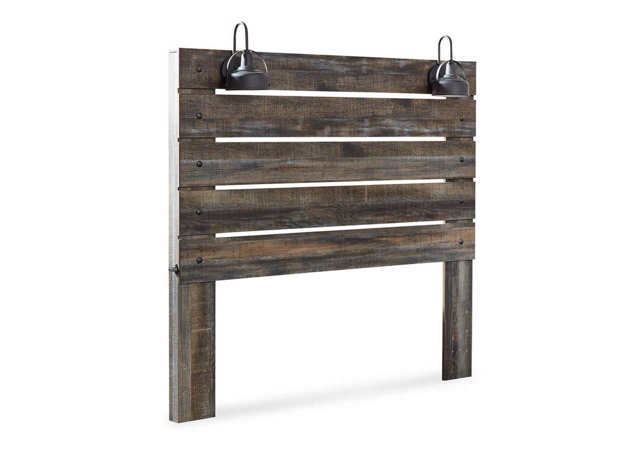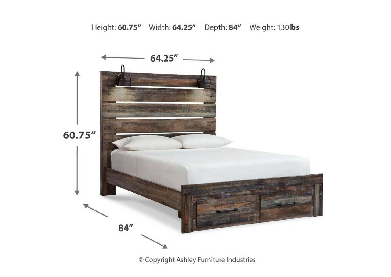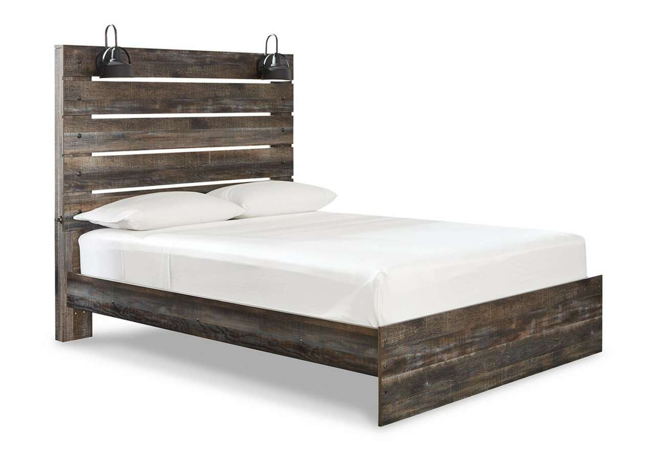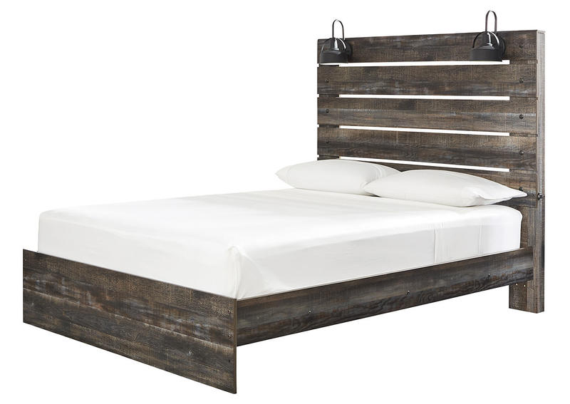 When merged in just the right way, rustic and industrial styles can make one happy marriage. Case in point: this queen panel bed. A refined take on barn board beauty, its complex, replicated wood grain showcases hints of burnt orange and teal tones for a sense of weatherworn authenticity. Love to read in bed? You’re sure to find the pair of retro-chic light sconces and USB plug-ins on the open-slat style headboard such a bright idea. Mattress and foundation/box spring available, sold separately.Includes headboard, footboard and rails