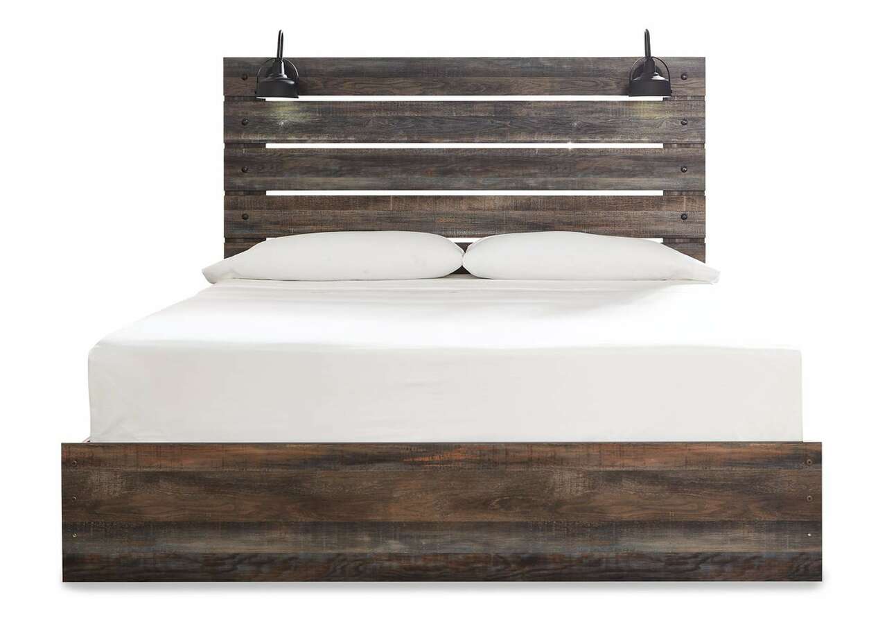 When merged in just the right way, rustic and industrial styles can make one happy marriage. Case in point: the Drystan king panel bed. A refined take on barn board beauty, its complex, replicated wood grain showcases hints of burnt orange and teal tones for a sense of weatherworn authenticity. Love to read in bed? You're sure to find the pair of retro-chic light sconces and USB plug-ins on the open-slat style headboard such a bright idea. Mattress and foundation/box spring available, sold separately.Includes headboard, footboard and rails