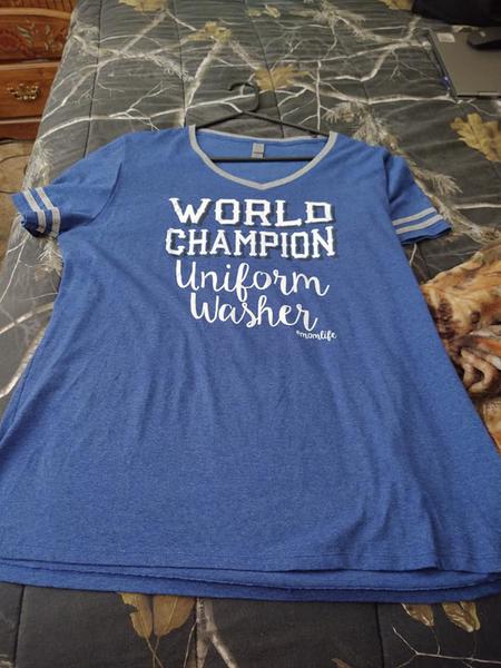 Women's Tshirt: "World's Champion Uniform Washer (Mom Life)" $10 Size: 2 xl (Fits more like an Xl)