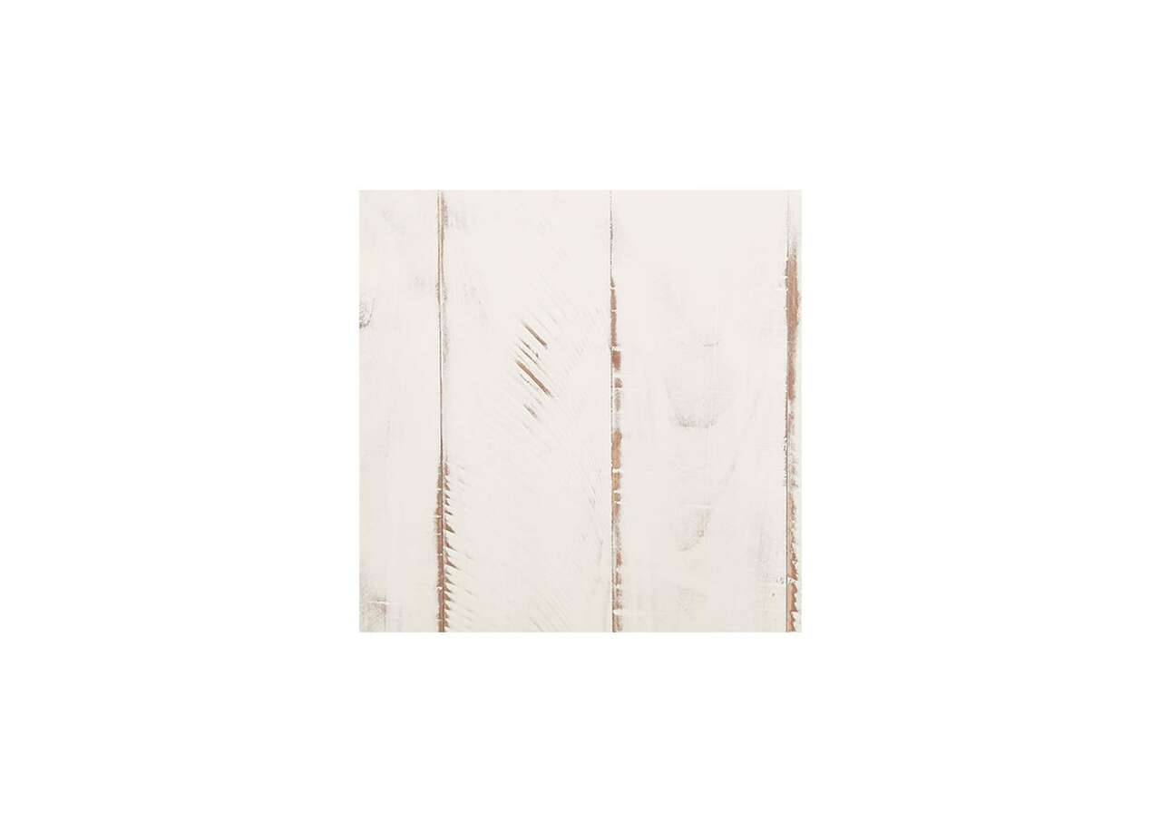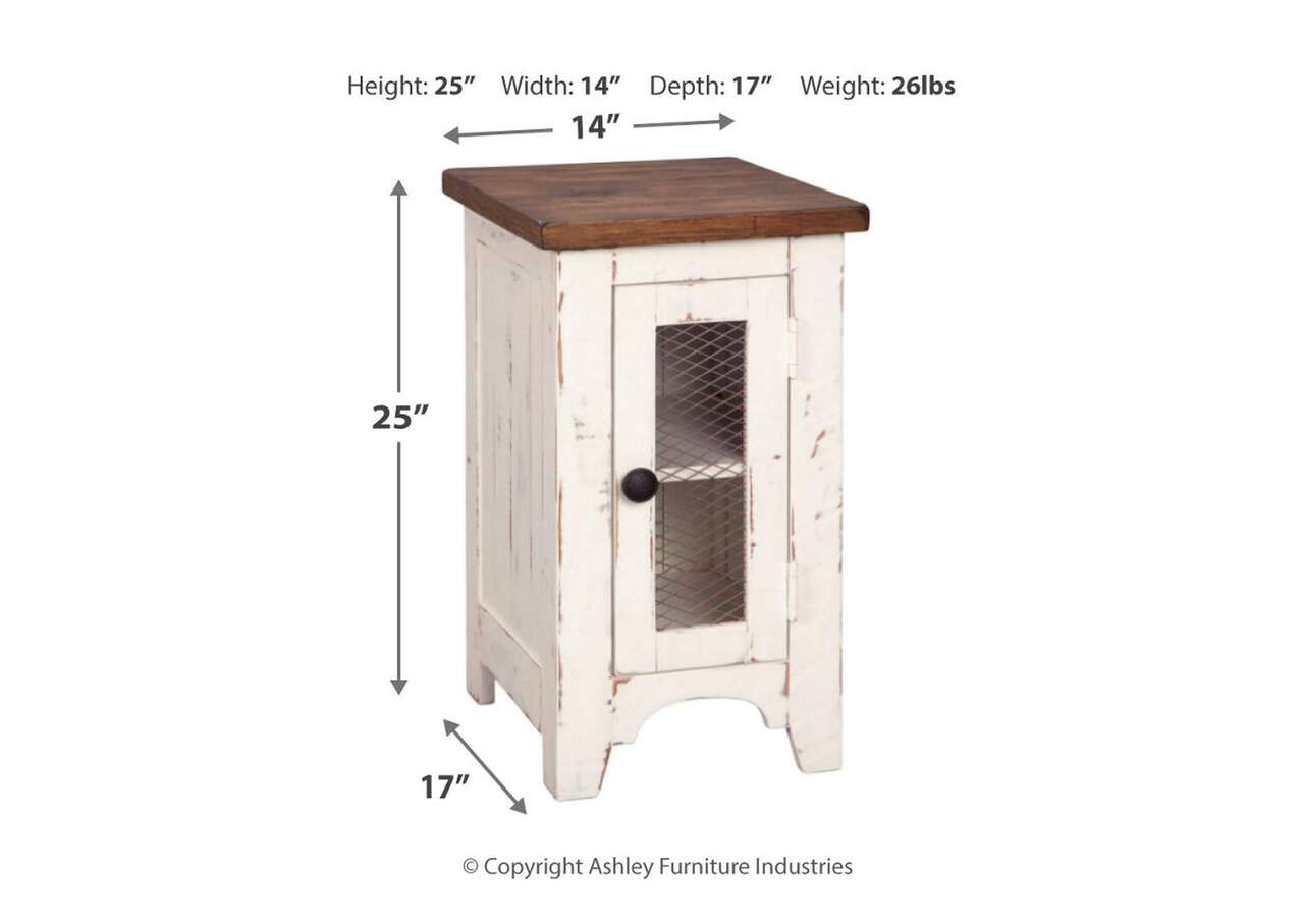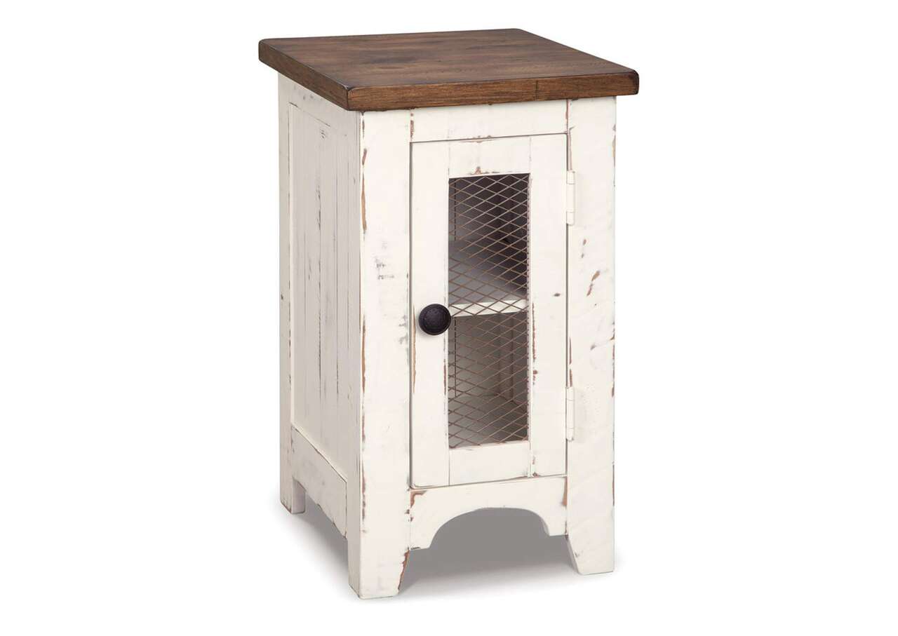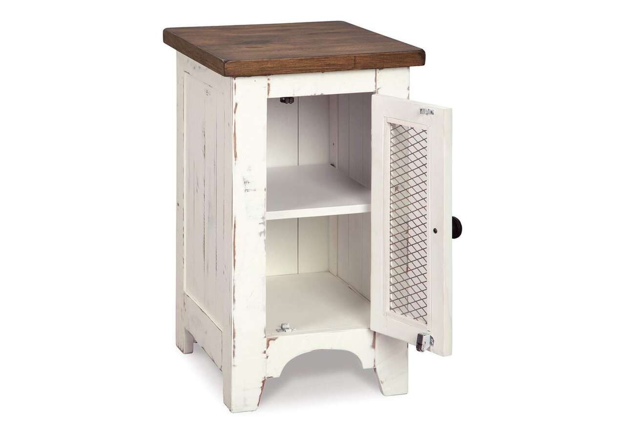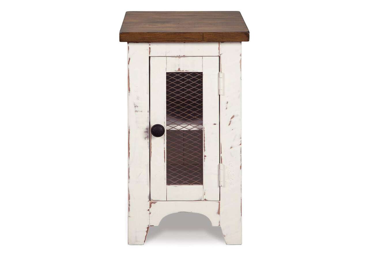 Double take. Sporting a two-tone finish that pairs a distressed vintage white with aged natural pine color, this chairside end table elevates the art of rustic farmhouse living. Enhancing its charm: shelved storage visible through the cabinet door with inset metal grill.Made of veneers, wood and engineered wood