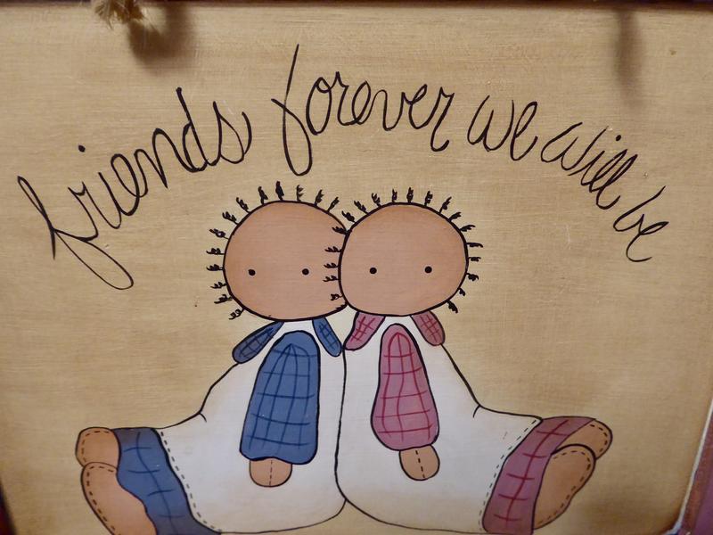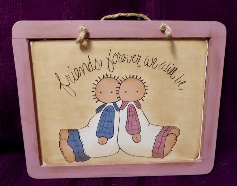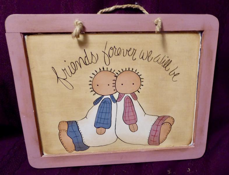 ***It Measures … 9 1/2 inches across and 7 1/2 inches long and it has a jute hanger for hanging it onto a wall. The frame is a pretty pink color and the cute little primitive girls are wearing blue and pink dresses with cream colored aprons.