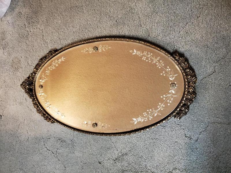 Antique carved wood and metal etched mirror, more than 100 years old, 31 inch tall x 15 inch wide.