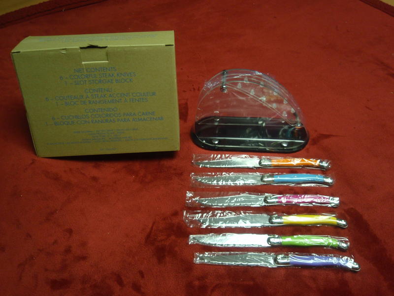 $10 Colorful Steak knives set with holder. NEW IN BOX.