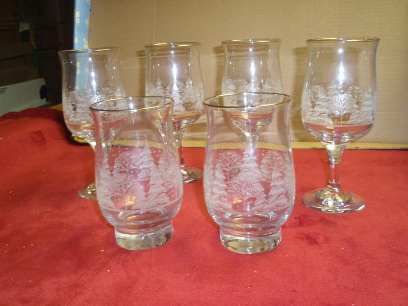 Price reduced. AVON 23 piece holiday glassware set with trees, 2 mugs, 11 stem glasses, 4 tall glasses, 2 tumblers, large serving bowl, vase, candle holder and candy bottle. NEW IN BOXES.