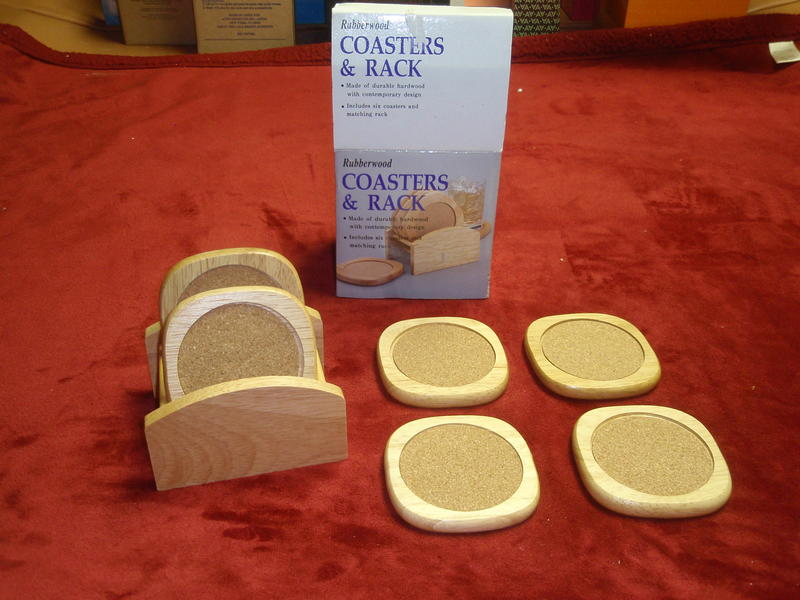 $8 Set of 6 wood coasters with rack, NEW IN BOX