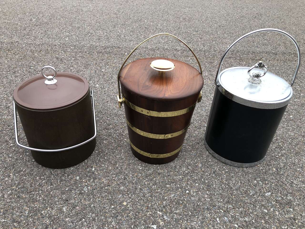 These vintage Ice Buckets work so well and they add a great vintage, mid century vibe to any room or event The wooden ice bucket w brass rings just sold. Most are just $20 eac