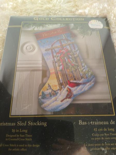 Christmas Sled Stocking 16 in Long Count Cross Stich Never Been Open