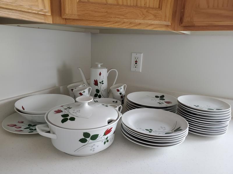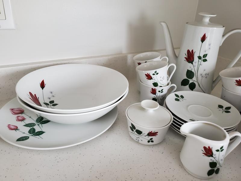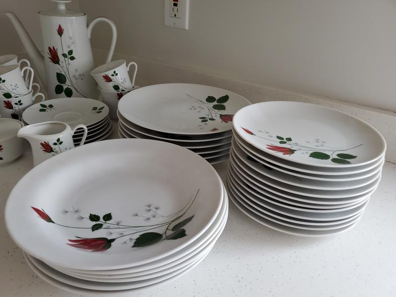 Serves 6 people, includes 6 dinner plates, 6 soup plates, 2 serving bowls, 1 serving plate, 1 soup serving bowl, 12 salad or desert plates, 6 coffee cups with 6 saucers, creamer and sugar bowls, I coffee serving carafe, Nostalgic "Winterling Roslau" German collection from the early 60's.