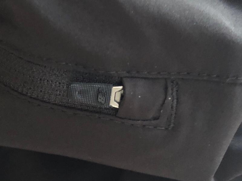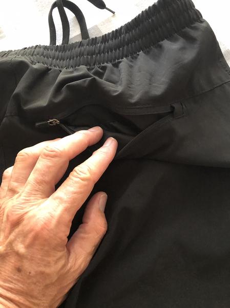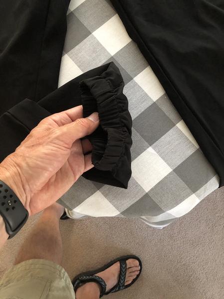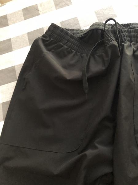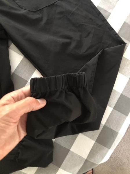 They are in like new condition. Two pockets in front one zippered in the rear. They have a drawstring as well as elastic waist band and elastic at the ankles as well. They’re rad jet black in color.