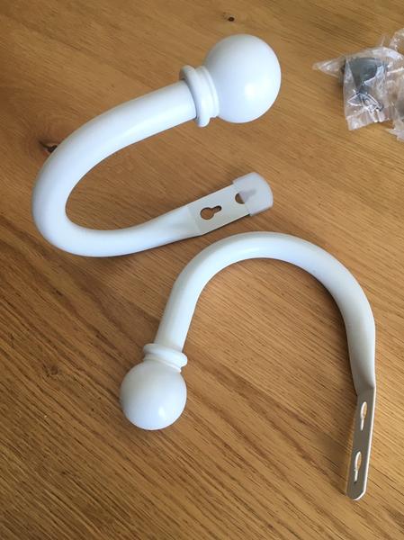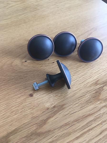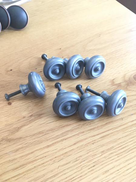 I have several different types of hardware for use on kitchen cupboards or bathroom cabinets, dressers, whatever. I also have a pair of white curtain hold-backs. All items are in new or like-new condition. -4 IKEA SVEP handles—$5 -2 white curtain hold-backs—$2 -7 pewter knobs —SOLD -4 antique bronze knobs—$4 -10 IKEA matte black pulls (from Hemnes collection)—SOLD