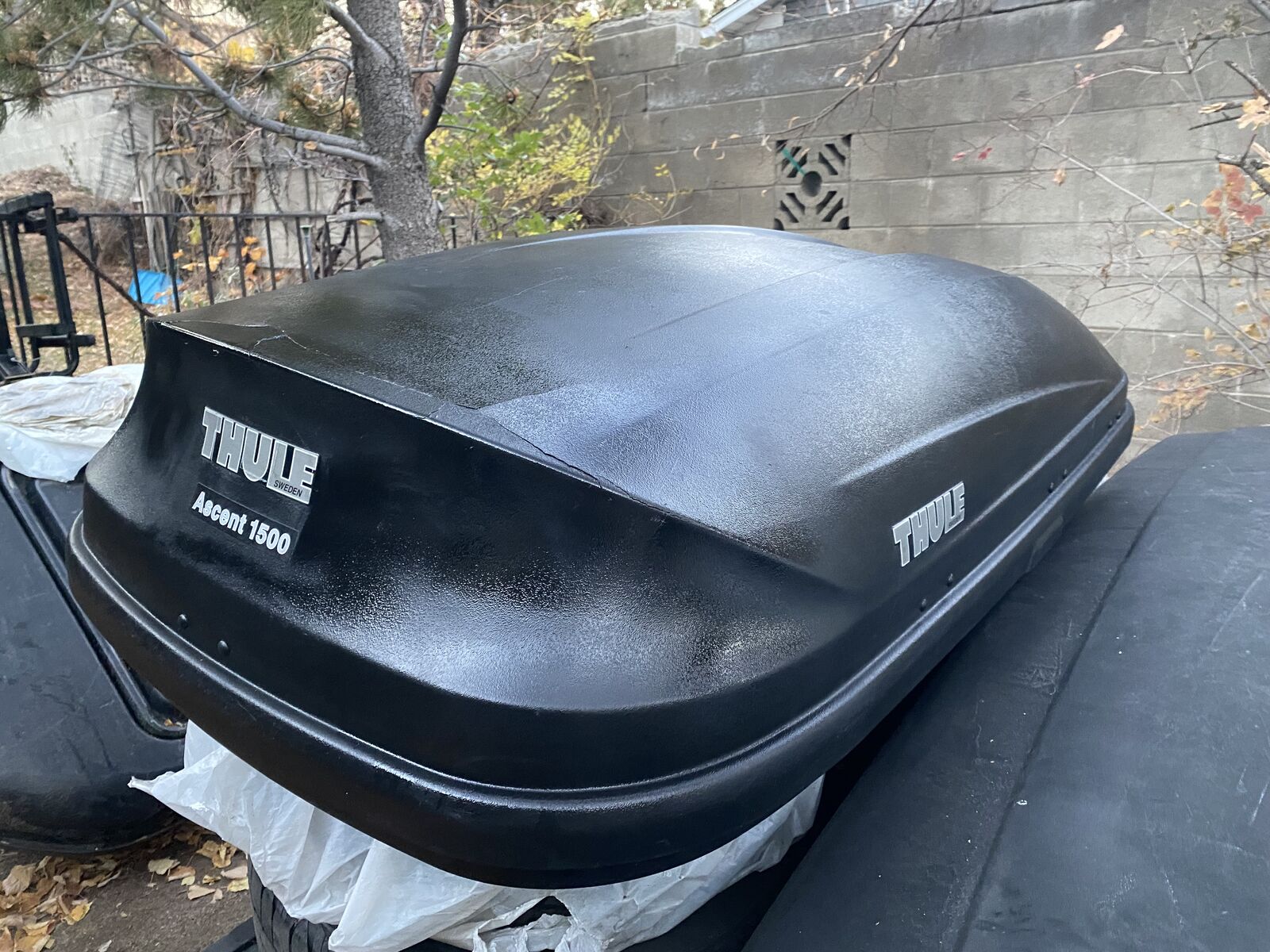 -- Thule Acsent 1500 black $375 -- 67in L x 35in W x 16in H-- 15 cf capacity--dual side opening-- quick snap mounting hardware allows it to automatically adjust to bar spread and quick claws with one big knob tightens the box to bars-- locks and 1 key included--cracks on top back are properly repaired--no leak and hardly visible