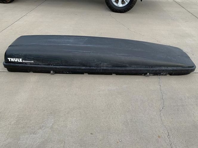 -- Thule Summit - Black $345--14cf capacity-- 88in L x 26" W x 15"H-- low profile--passenger side opening--mounting hardware allows it to attach to most bars. One small crack repaired and it's hardly visible