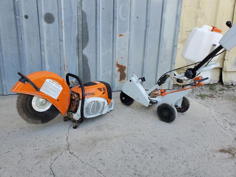 Stihl TS800 concrete saw with rolling water tank for rent starting at $99 per day. Blades and discs sold separately.
