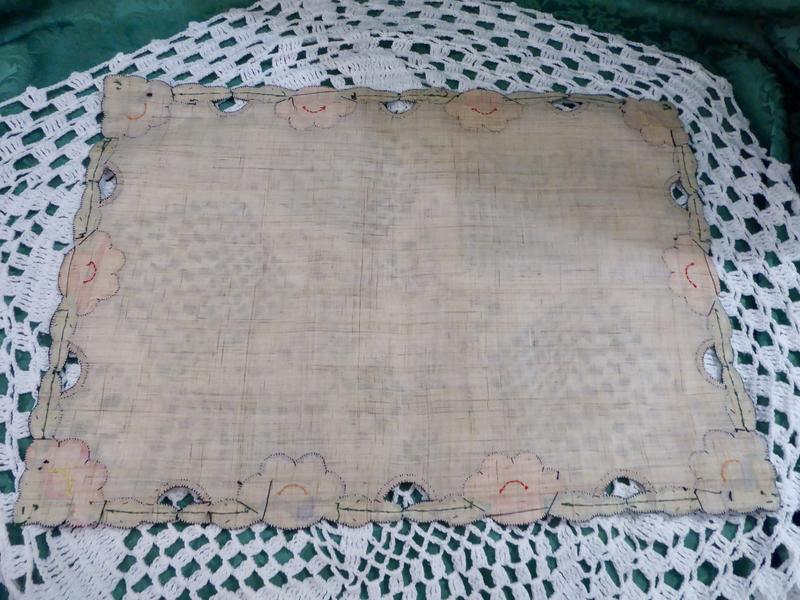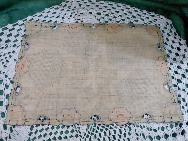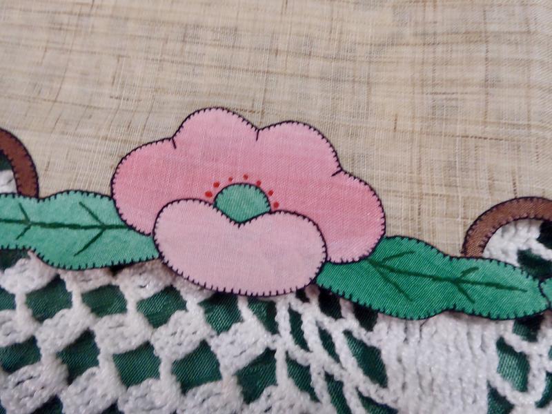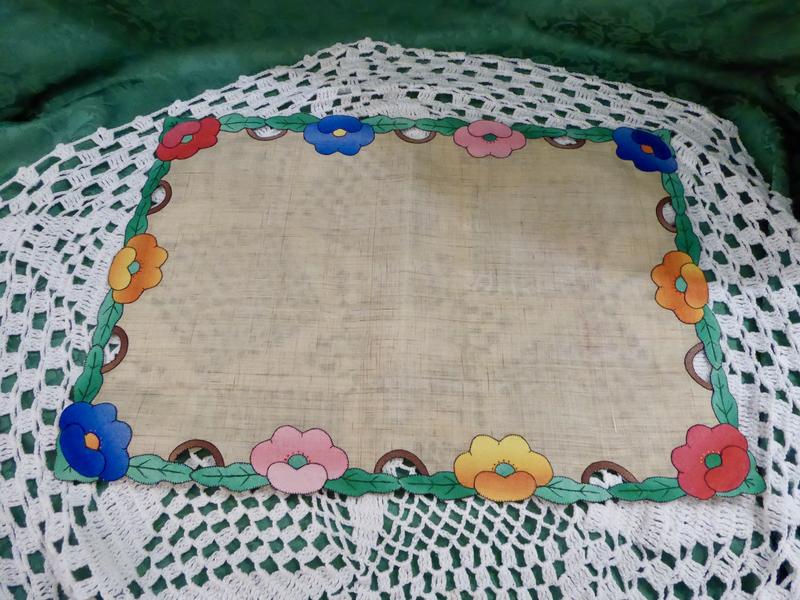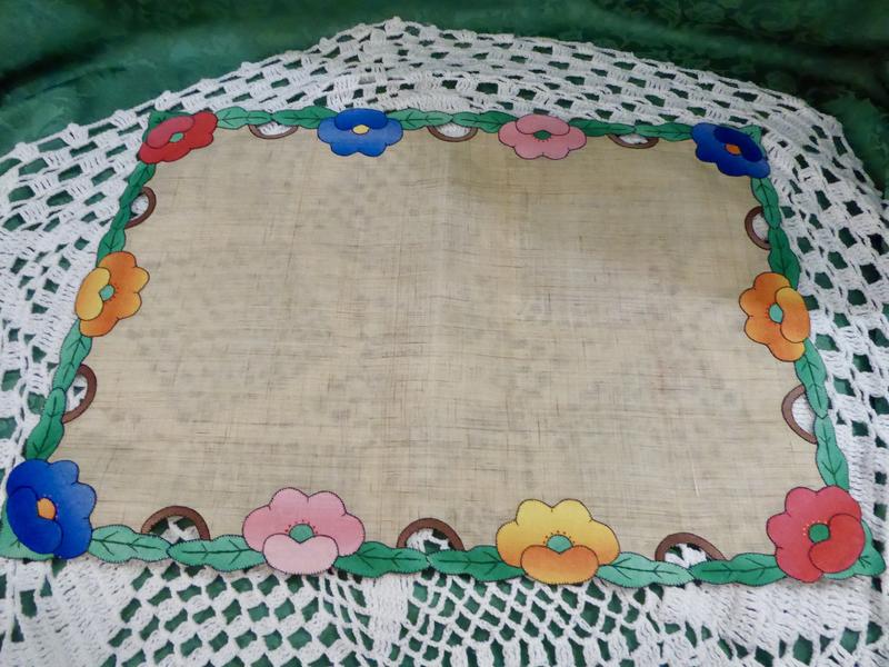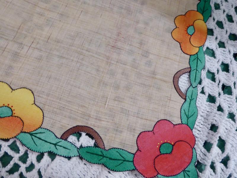 **The center is a beautiful dark cream / tan color woven type fabric and the flowers are in reds, oranges, blues and pinks with green leaves.