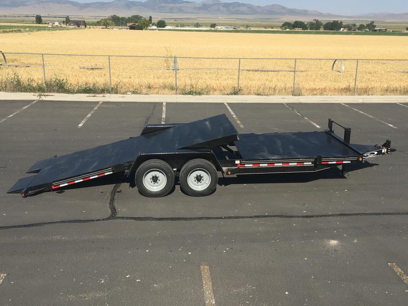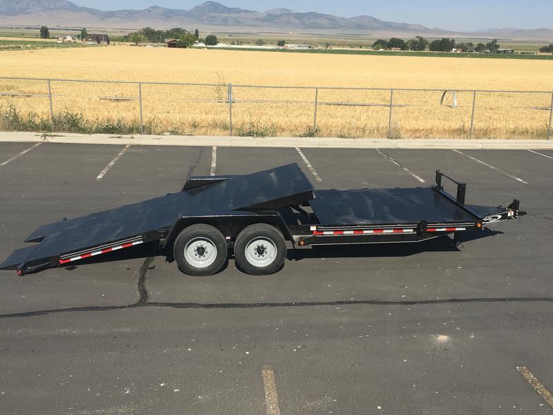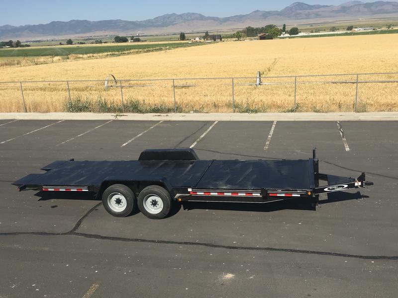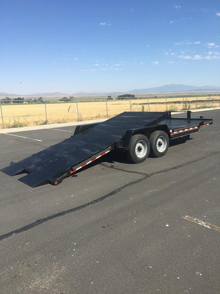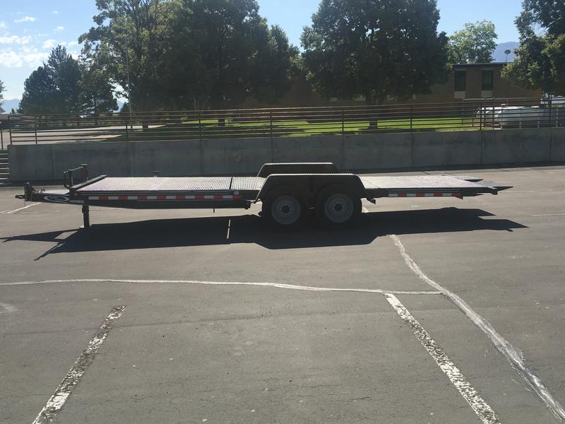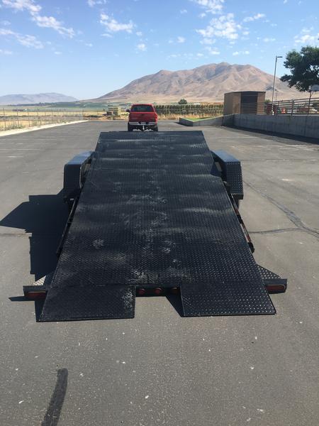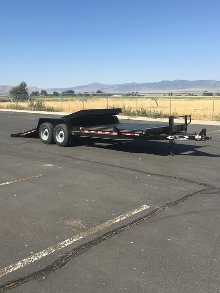 The 17000 GVWR Deluxe Metal Floor Tilt Equipment Trailer like all our other Deluxe models is fully equipped with all our best features. A heavy duty running gear package with heavier oil bathed axles, tires, and a super duty cast iron coupler are the key features. The running gear features 8,000 lb. 8 lug axles with 17.5 in. heavy duty load range H radial tires and heavy duty slipper spring suspension. The coupler is a super duty three bolt cast iron unit. The frame is 6 in. channel with a 6 in. channel wrap around tongue. A tool box with a lockable lid, 17 in. cross-member spacing, stake pockets with a rub rail on the outside, and full reflective tape are all included. A US made sealed modular wiring harness with lifetime LED lighting assures trouble-free lighting on every trailer. 1 year Warranty www.k2-trailers.com Call or Txt anytime Brian 801-472-1613 Chris 801-420-4076 Dealer 454A