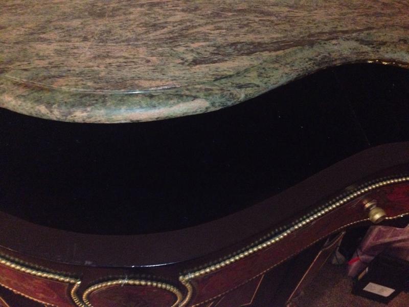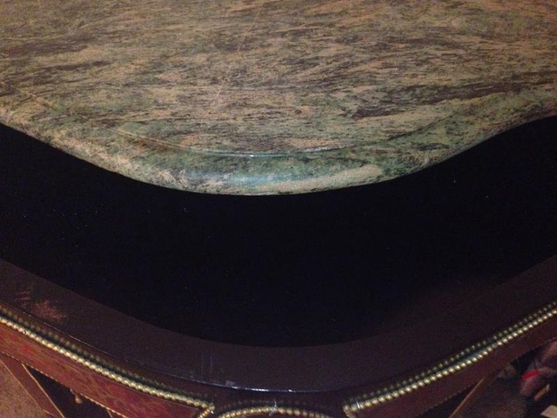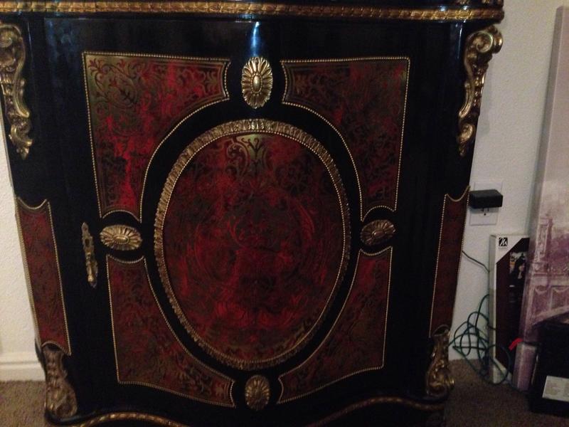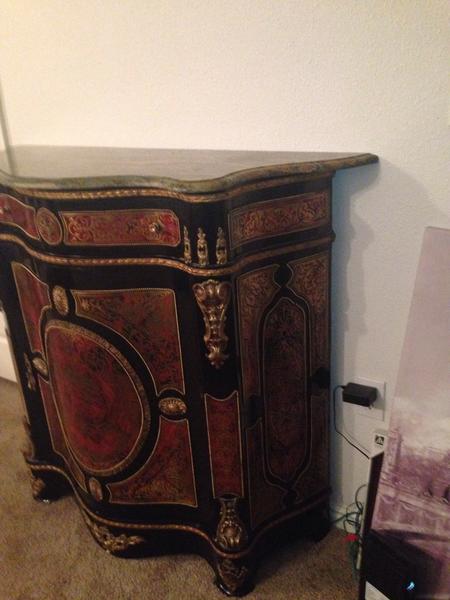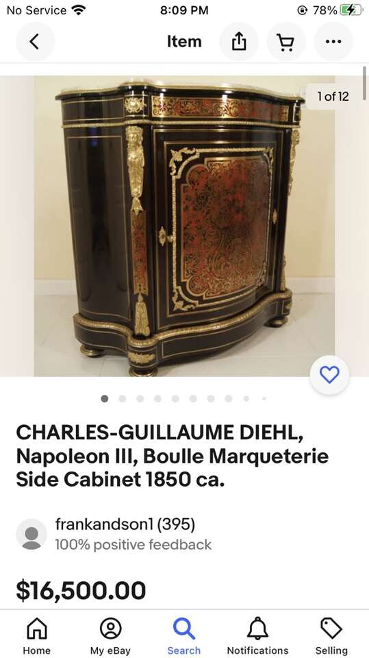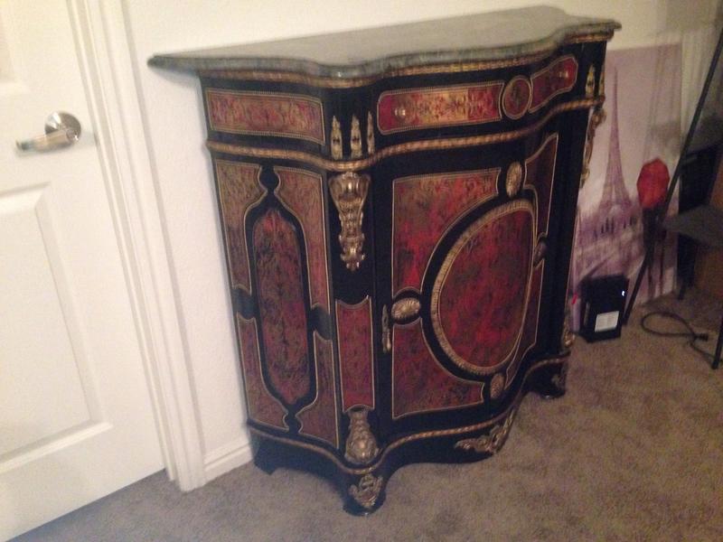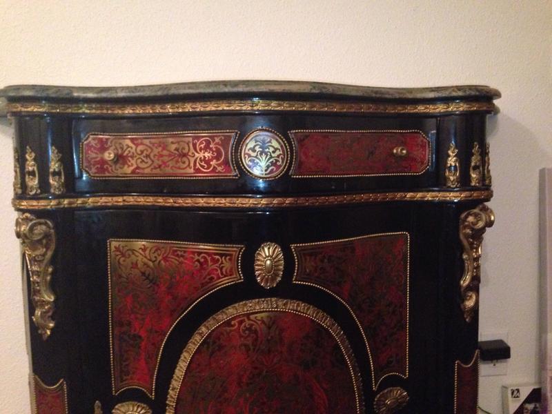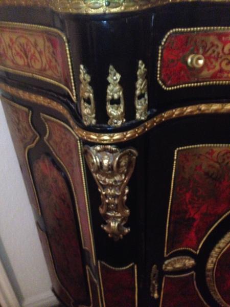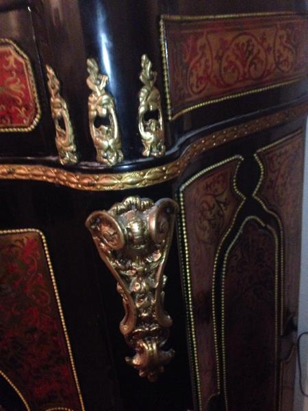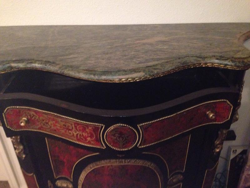 A Fine Napoleon III Gilt-Bronze Mounted Boulle Marqueterie Side Cabinet with a green marble top. Stamped CHARLES-GUILLAUME DIEHL (worked 1840-1887). Made in France, Circa 1850. Interior in mahogany of Cuba. (with shelves). Without key. Measurements: Height 105 cm | 41.34 in / Width 116 cm | 45.6 in / Depth 45 cm | 17.71 in Condition: Excellent antique condition A spectacular side cabinet of semi tall design, with an abundance of gilt bronze ormolu mounts and exquisite original Boulle Marqueterie. Of rectangular semi shallow serpentine breakfront form with concave sides. Exterior in dark brown ebonized wood, gilt bronze serpentine braided cord mounts repeat at various levels. Caryatids gilt bronze females along the outer pillars. Original exquisite Boulle Marqueterie front door panel, across the top and sides. About Napoleon III Style: The “Second Empire” came about when Louis Napoleon (Napoleon Bonaparte’s nephew) declared himself emperor as Napoleon III. Drawing on the past 500 years of French style, the Napoleon III style is an eclectic and somewhat ostentatious mix. Often several furniture styles were mixed for a single piece of furniture. Whimsical shapes, painted wood and mother of pearl were common. Dark woods, ebonized or “japanned” woods, cast iron, paper maché and ivory inlay were implemented. Cabinets, commodes and desks crafted in the manner of Boulle and similar renowned craftsmen of the 18th century became a feature of fashionable salons, though such pieces tended to lack the finesse of the original. About Charles-Guillaume Diehl: Of German origin, Charles-Guillaume Diehl was born in Steinbach (Grand-Duché de Hesse) on the 20th July 1811. He moved to Paris in 1840, to 3 rue de Thorigny, and then to 170 rue Saint-Martin, but wasn’t listed in the Almanach du Commerce until 1850. At this point, he set up at 16 rue Michel-le-comte. He then moved to number 21 on the same street (1851-1842) and to number 19, until he died (1853-1885). His workshops were located on 39 rue Saint-Sebastien, where he employed six hundred workers in 1870. Training Tabletier, he developed his production towards making luxury furniture, attracting crowds at the Universal Exhibitions. Diehl made elegant little pieces of furniture out of rosewood and thuya in the style of Boulle, but instead these ones were caskets (decanters, boxes for games, gloves, cashmere, and jewellery) and were what made him famous. Jules Mesnard, in 1867, summarized Diehl’s production nicely “his work embraces all artistic furniture. The Parisian and international clientele loved the abundant and tasteful luxury objects that he produced, as much as the pleasingly elegant objects, found in the “articles de Paris” and French marquetry. His marquetry skills were rewarded by a silver medal at the World's Fair of 1867 in Paris. Outside this production; he was known for his furniture, tables, bases of cabinets, cabinets, often of very high quality, decorated with bronze or panels or elegant marquetry. During the World's Fair of 1878 in Paris, although he had obtained French nationally in 1872 (remarkable considering it was not even two years after the defeat of Sedan); Diehl was disqualified from the competition because of his passed success. If interested, call or text at 720- 6828395 Thank you.
