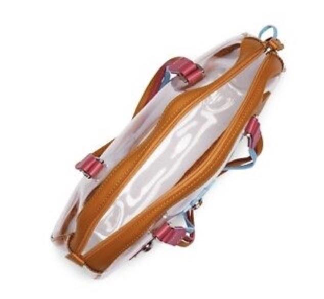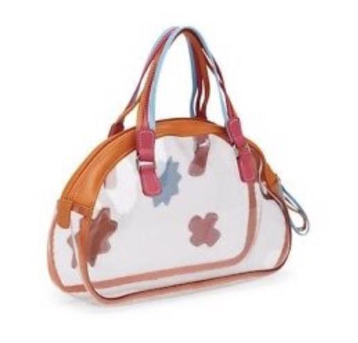 Millefiori Vinyl Bowling Bag. PVC exterior with leather trim. - Made in France. 5" handle drop. - Dual strappy top handles. - Top zip closure. - Exterior features embroidered and embellished front details. Brand New.