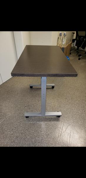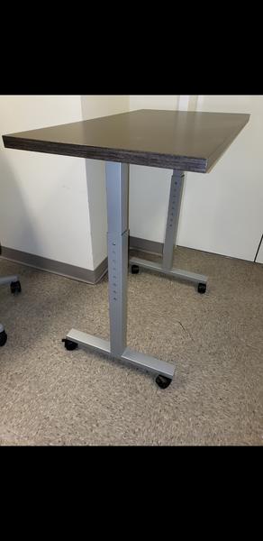 Mobile height adjustable workstation. 36"W x 20"D height adjustability from 26"H-35"H. (Manual adjustment) Rectangular 36"W x 20"D high-pressure laminate worksurface, height adjustable T leg base support w/locking casters