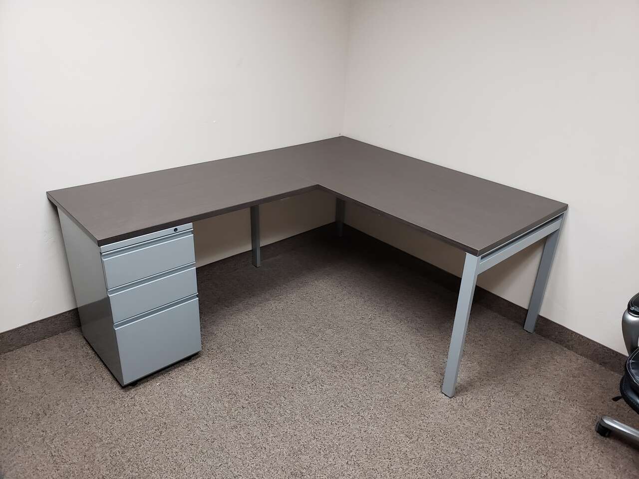 L-shape desk. 60" x 66" x 24"/30"D x 29"H including - high-pressure laminate work surface, dual H leg support on 30"D, post leg or filing cabinet support on return, w/(1) mobile or 3-drawer filing cabinet.
