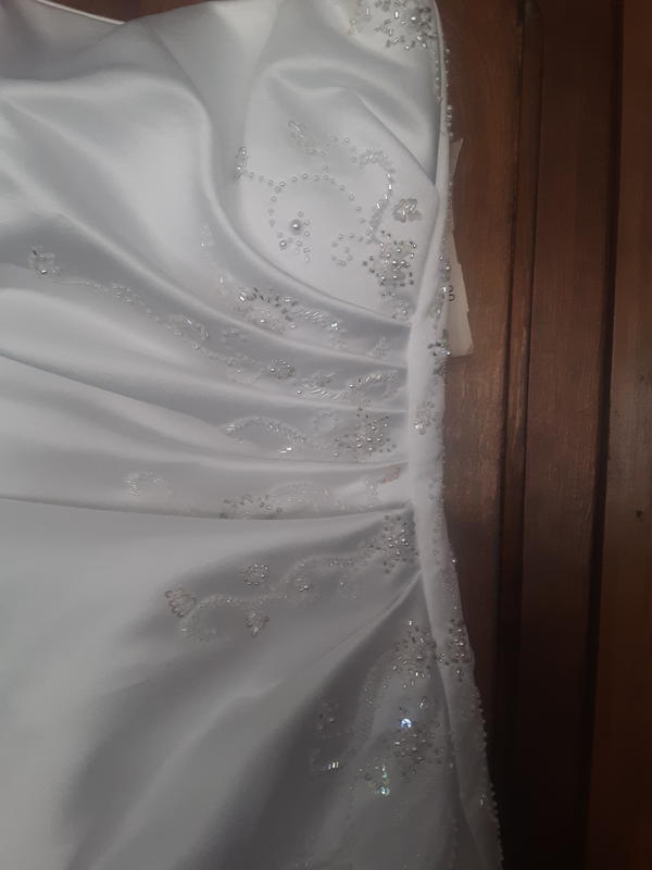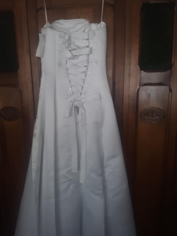 Beautiful Strapless wedding dress. New still has tags. Excellent condition size 2.it has a lace up back and split on the side to show tulle underneath. Comes with extra fabric for a fill or Jacket. Cash or venmo only. Pickup only. Text or call 801-699-2583.