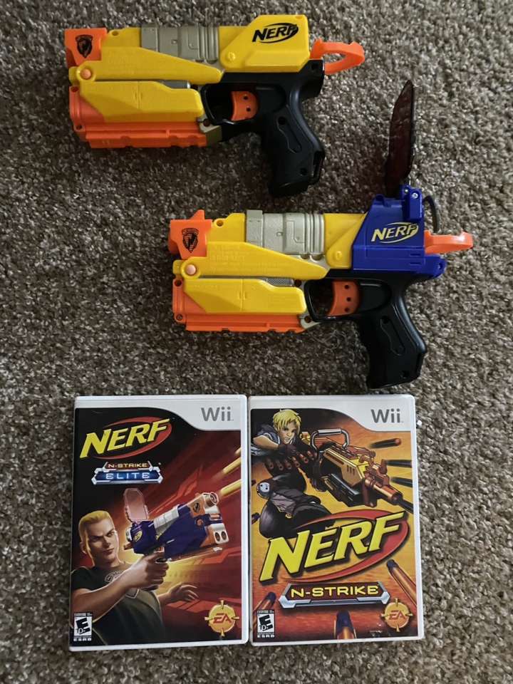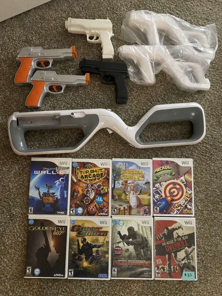 White Wii zapper guns $20 (4 available) Orange/White rifle w/ scope $45 Wild West brown/silver pistol $25 Nerf Elite yellow/blue $30 Nerf N-Strike yellow/black $20 Silver/orange pistol $25 White or black small shotgun (holds remote and nchuck) $10 Orange/green rifle $25 White sideways 8, holds both remotes inside, very durable, high reviews $60 Orange/White rifle no scope $35 White machine gun $20 White Wii zapper (most common, not shown) $20