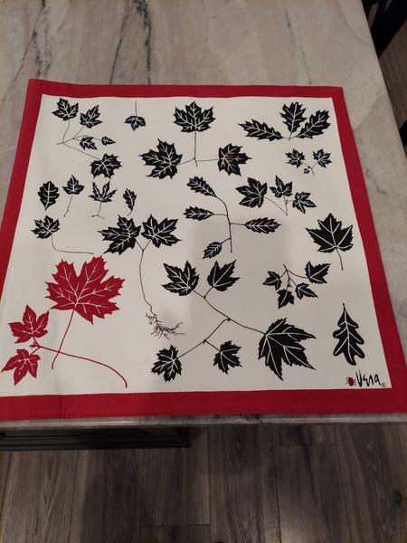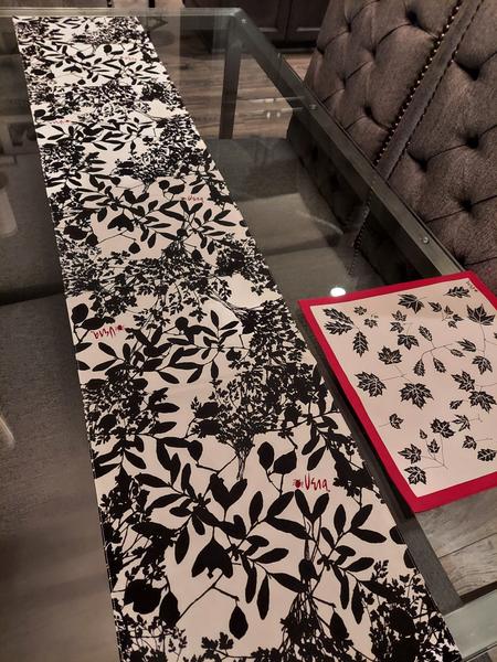 These square Vera Bradley placemats are white canvas fabric with red trim and black leaves. One red accent leaf. Matching table runner has black leaves with white background. Several small, red ladybugs as accents in the pattern. Six (6) placemats and (1) table runner. Like new. All items for $15. MEASUREMENTS Table runner: 68 1/2 inches x 14 inches Placemats: 15 inches x 15 inches Smoke free, pet free home.