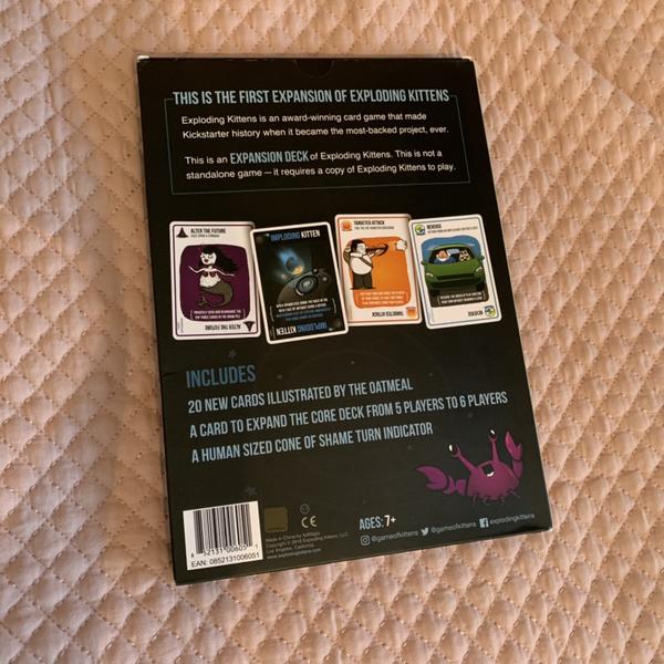 Retail price: $15 Award-winning card game This is a expansion deck of Exploding Kittens. This is not a standalone game-it requires a copy of Exploding Kittens to play. Includes: •20 new cards •A card to expand the core deck from 5 players to 6 players •A human sized cone of shame turn indicator Do not text me for a google code. cash only