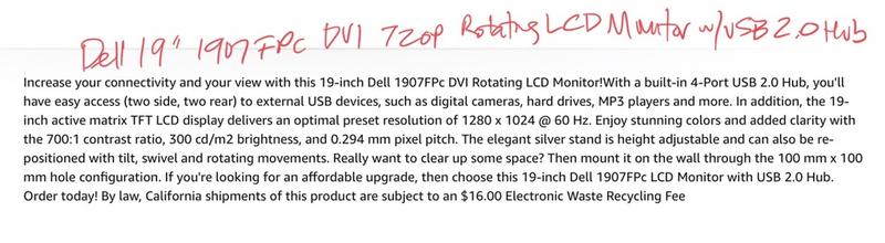 What we have here is a Dell 1907FP 19 inch 1280 x 1024 Monitor in good shape let me begin with a disclaimer: Disclaimer: The power button is in the on position and is kind of stuck there so this monitor is “always on” if you will you could also use it with a power strip and then power your computer and monitor on and off like that or unplug it each time whatever you need to do there but I will reflect that issue in the pricing...it is in the always on position as indicated in the images. Other than that this monitor is in great shape and has a lot of great features as you will see from the spec sheets that I have attached as images and the spec information that I have down below. The monitor stand for this is an epic version probably the best Dell has put out it will go up down the monitor will spin it will swivel from side to side it’s really pretty great and worth the asking price just for the stand in my opinion. Note also just the power cord. NO VGA cord supplied. if you have any questions or want to come see this thing in person let’s do that. I’d recommend bringing your laptop so you can see how great it looks. I’m gonna give you a great price today of Just $34.99. Thanks for looking at this item up for shopping with me here on KSL today and have yourself a great and blessed day! :-) Cash [only] accepted. FCFS Text is best. Located on the north end of Harrison Blvd here in awesome Ogden. Please be sure to check out all of my other listings! —— More specs 19-inch Dell 1907FPc LCD Monitor w/USB 2.0 Hub General Features: Black/Silver color scheme. 19-inch active matrix TFT LCD display Optimal preset resolution: 1280 x 1024 @ 60 Hz. Highest preset resolution: 1280 x 1024 @ 75 Hz Horizontal scan range: 30 kHz to 81 kHz