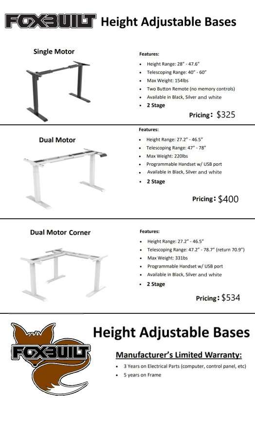 We are stocked and ready to deliver or we will load your car. 3 color options for the LEGS - Black, White or Silver $400 leg only - dual motor (height adjusts from 27” to 49 tall) We are confident we have just the right sit to stand desk to fit your needs.