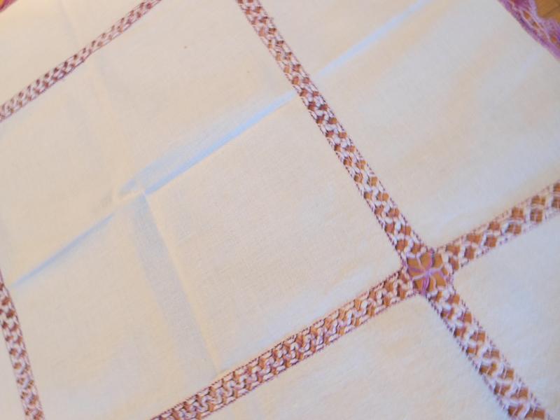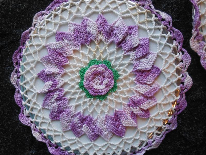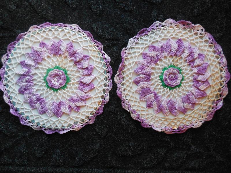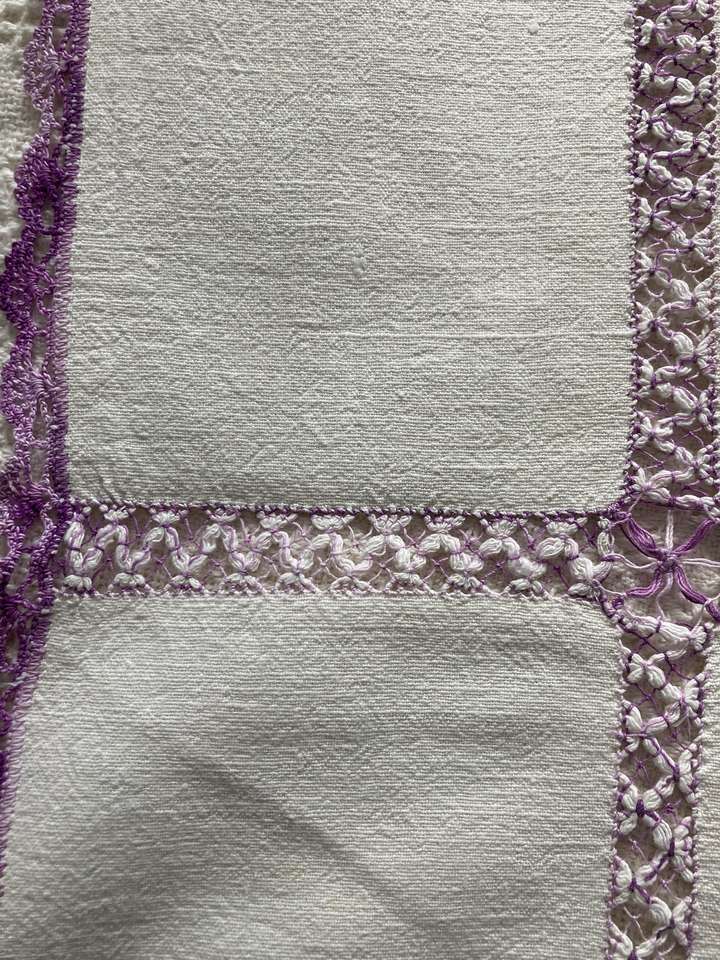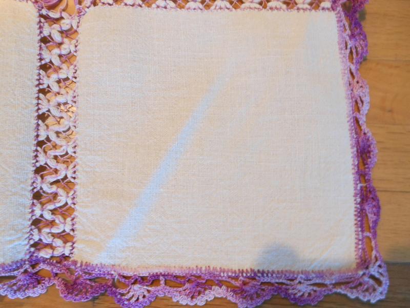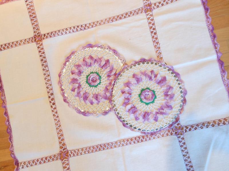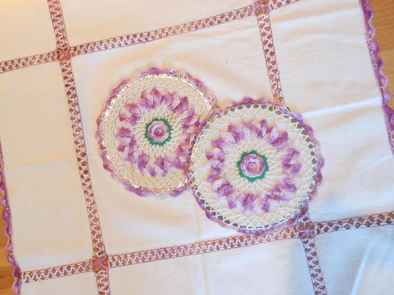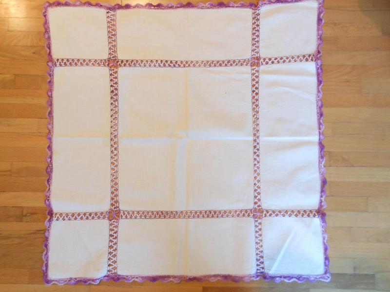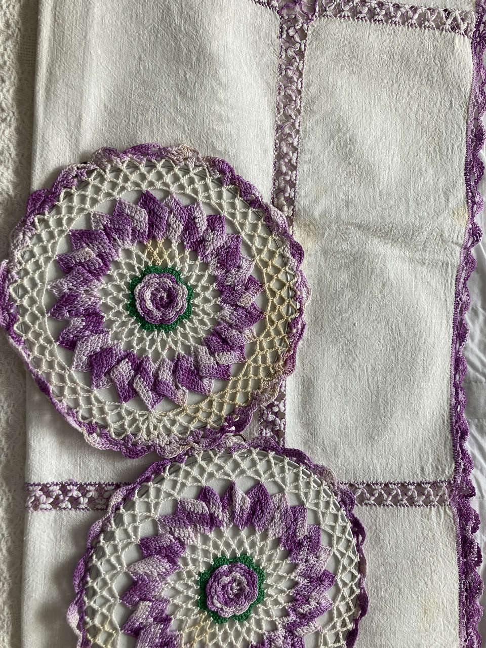 VenmoThis is a very old hand crochet 2 purple flower hot pads, they have a hook for displaying. there is yellowing. Also, matching small table cover, beautifully made of sqaures hooked together with stiching. It measures 29 x 28. perfect for small accent table or centerpiece on large table. There are several small yellow stains. Please see more by seller of collectibles, listings for downsizing of family home.