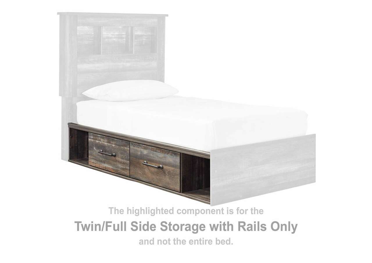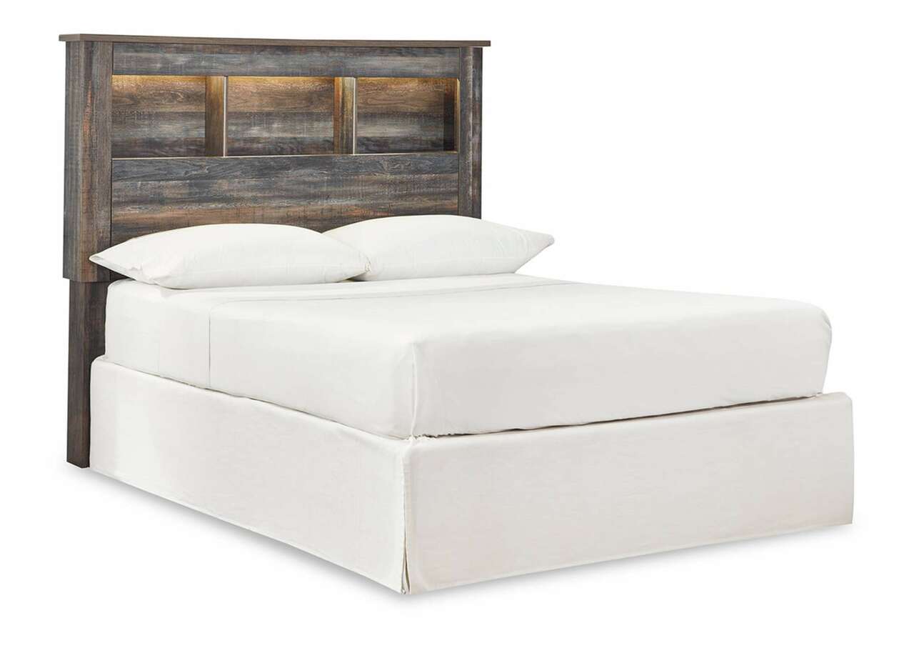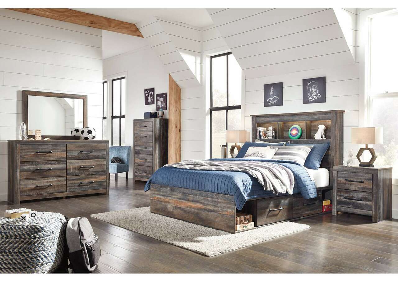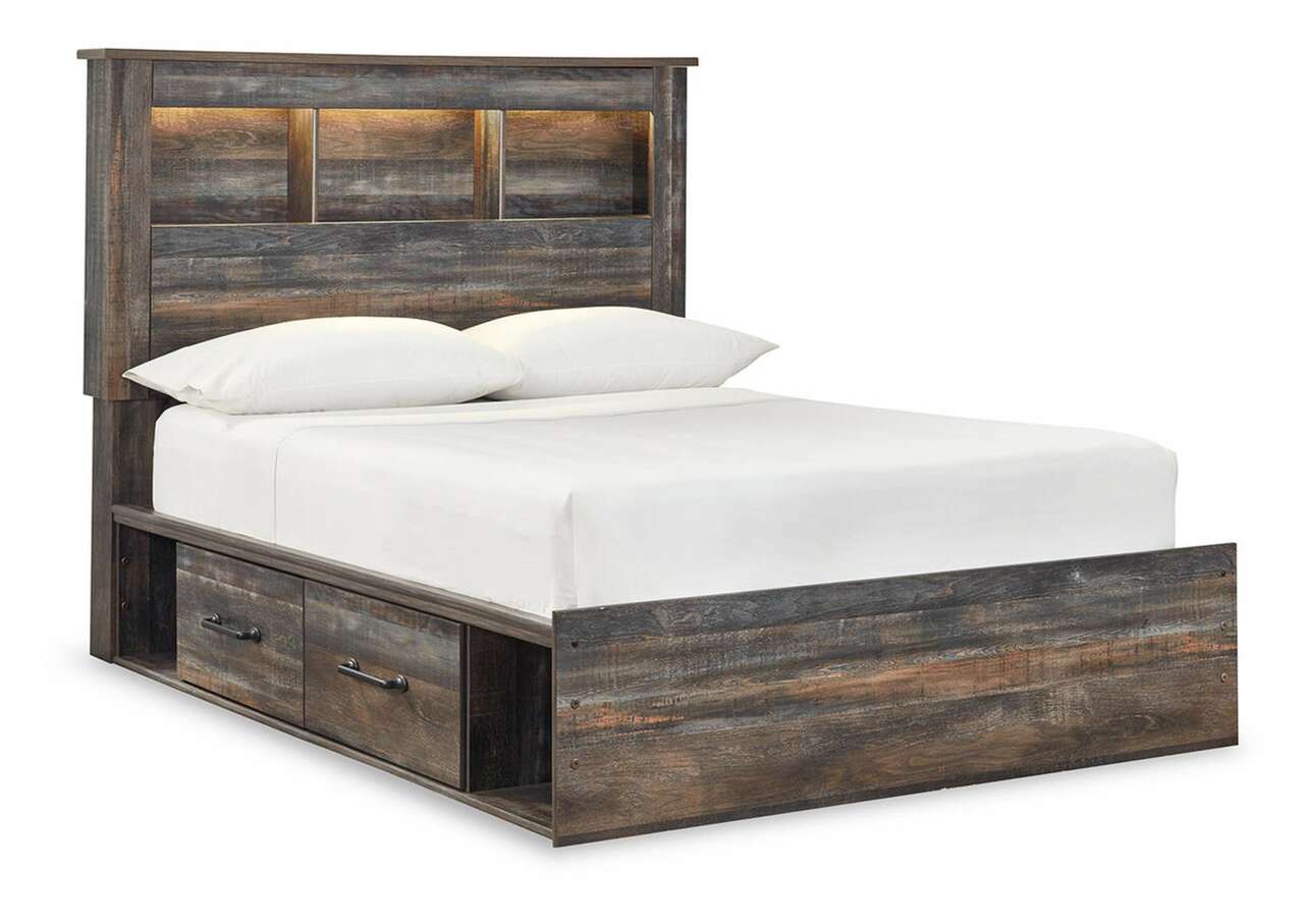When merged in just the right way, rustic and industrial styles can make one happy marriage. Case in point: this full bookcase bed with storage. A refined take on barn board beauty, its complex, replicated wood grain showcases hints of burnt orange and teal tones for a sense of weatherworn authenticity. Three open cubbies lined with a dimming LED light strip keep bedtime reads top of mind. Underneath the bed: a pair of smooth-gliding drawers and two open cubbies that accommodate casually cool storage bins.Includes bookcase headboard, footboard, underbed storage unit, platform rails and wood roll slats