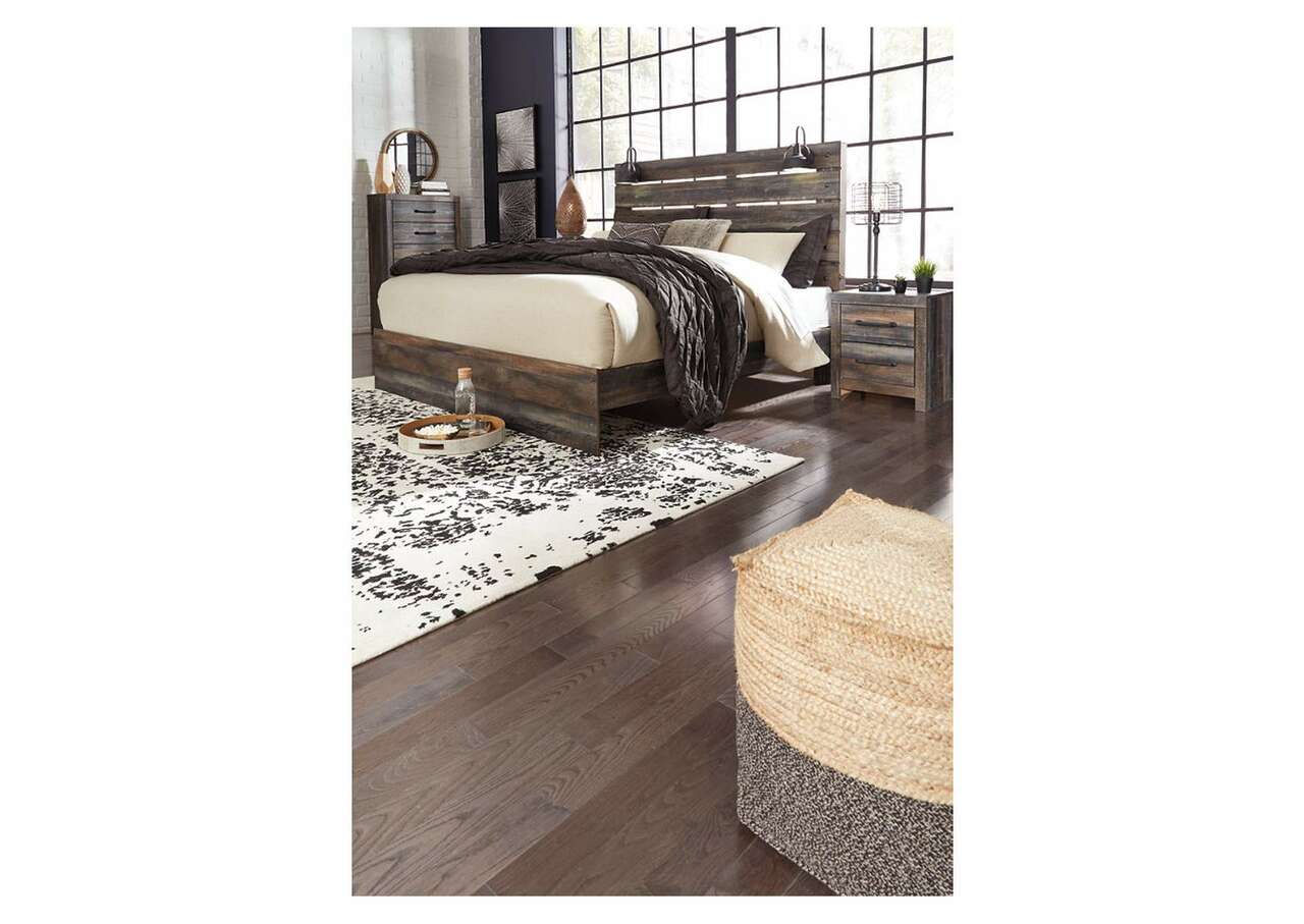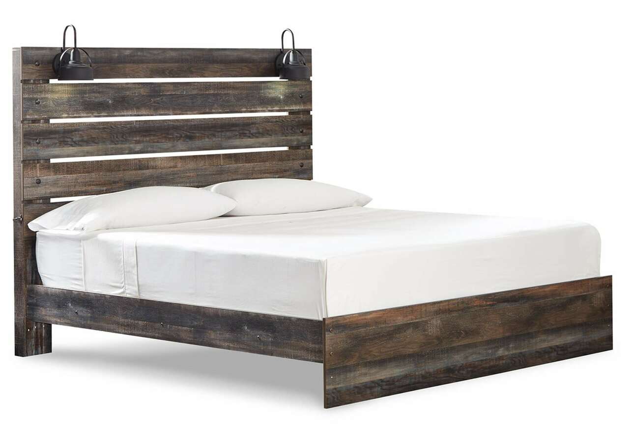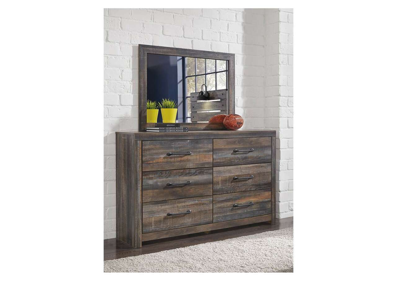 When merged in just the right way, rustic and industrial styles can make one happy marriage. Case in point: this bedroom set with panel bed and dresser/mirror. A refined take on barn board beauty, its complex, replicated wood grain showcases hints of burnt orange and teal tones for a sense of weatherworn authenticity. Love to read in bed? You’re sure to find the retro-chic light sconces and USB plug-ins on the open-slat style headboard such a bright idea. Elongated metal drawer pulls elevate the aesthetic.Includes bed (headboard, footboard and rails) and 6-drawer dresser with mirror