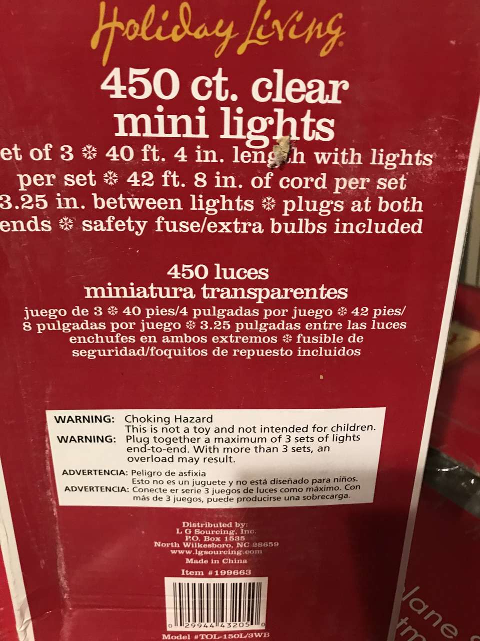 Holiday Living makes this box of clear mini lights. Each box has a set of 3 with a total of 450 lights. indoor or outdoor with green wire. I have 1 box for $20.00. CASH ONLY!