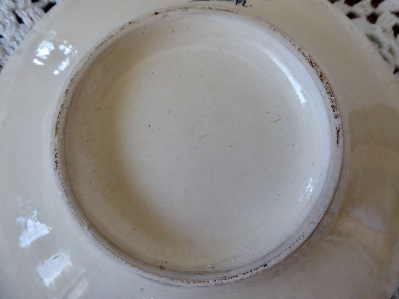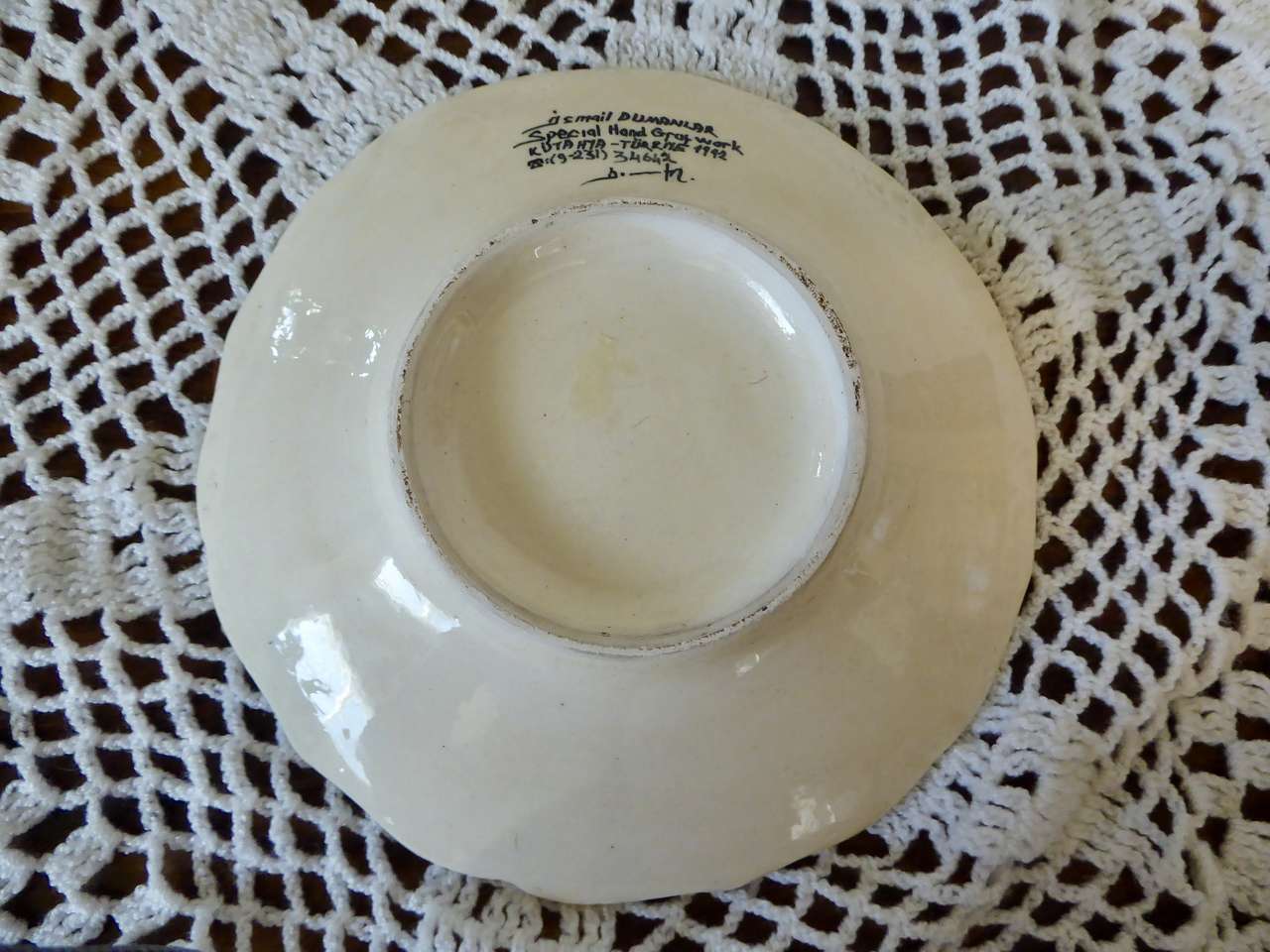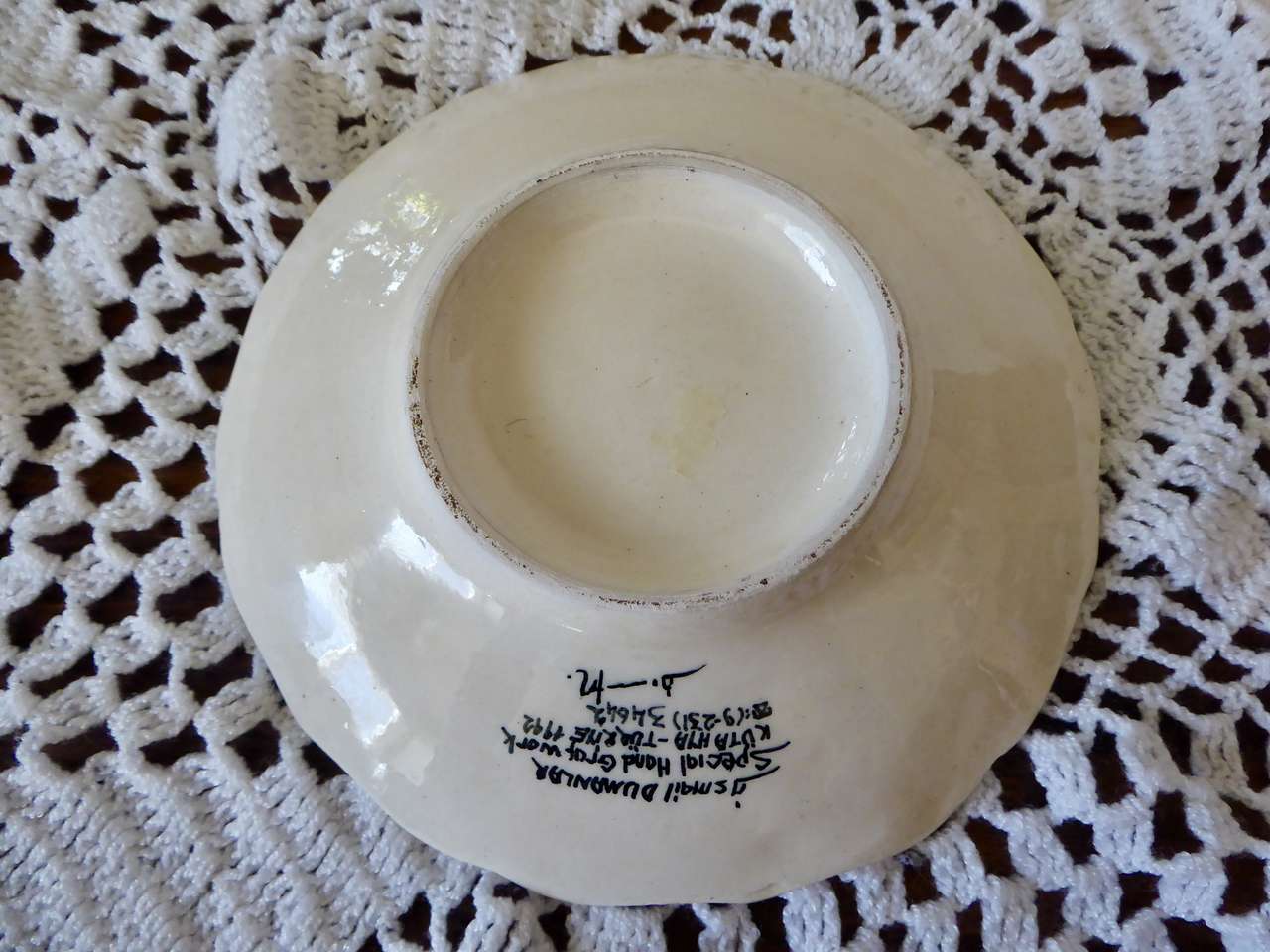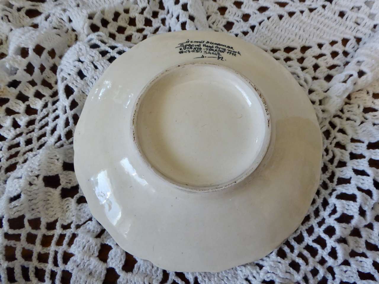 It Measures… 7 1/4 inches across. It is in very nice condition with no chips or cracks except for one small indention on the backside top area where it seems it was a little un smooth when it was made and fired in the kiln.