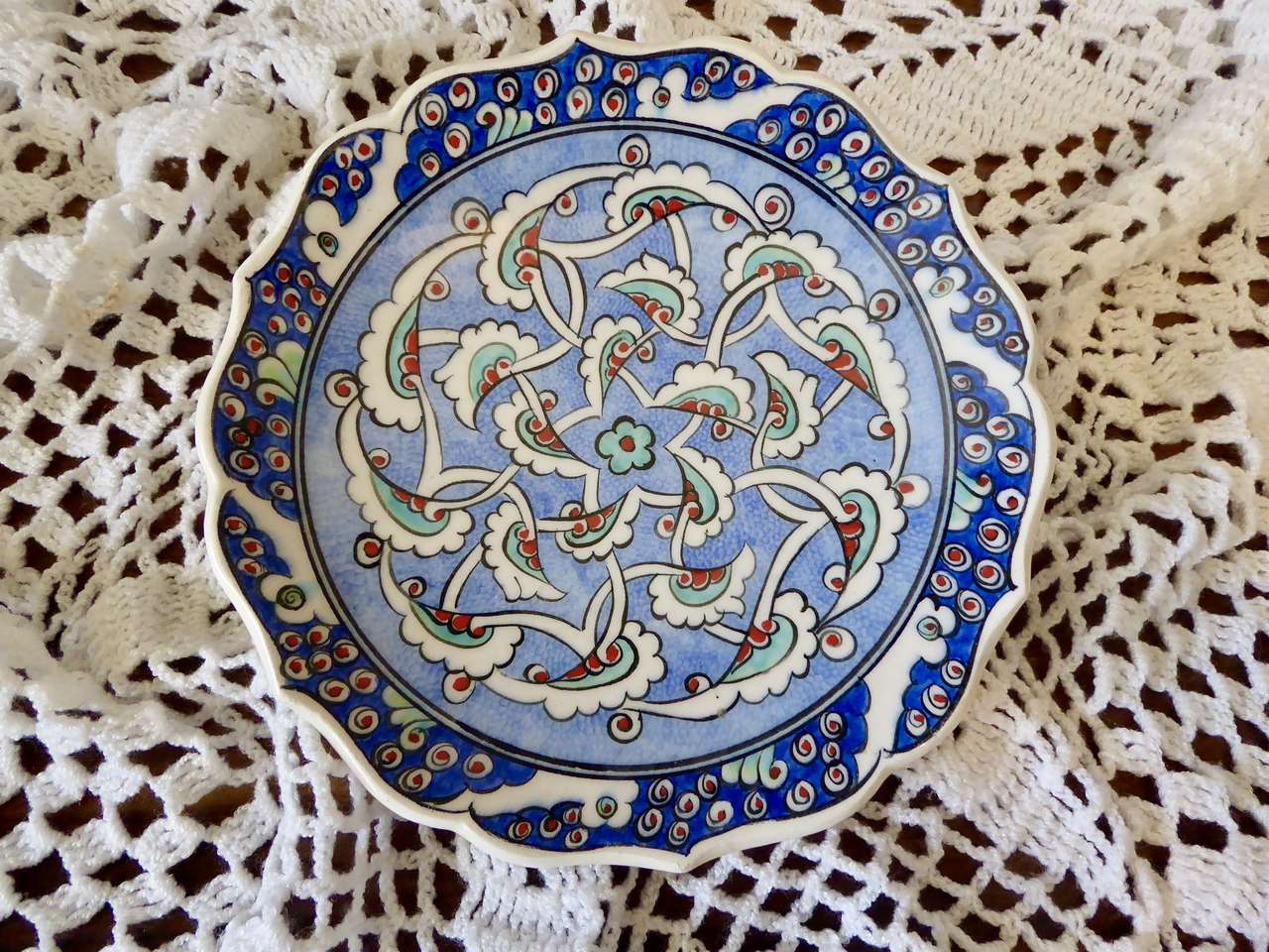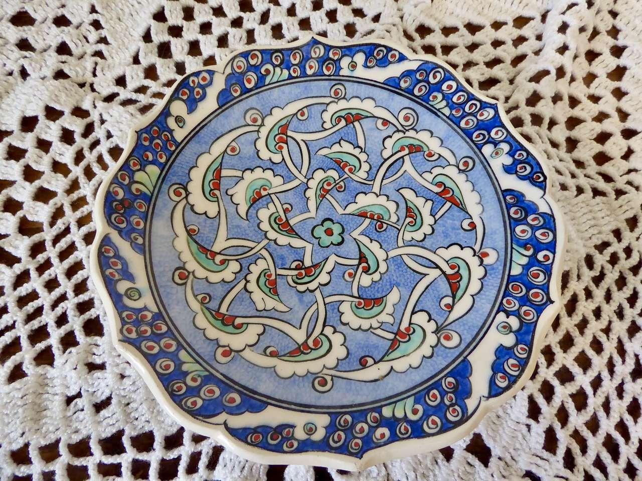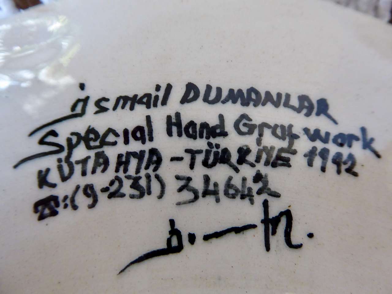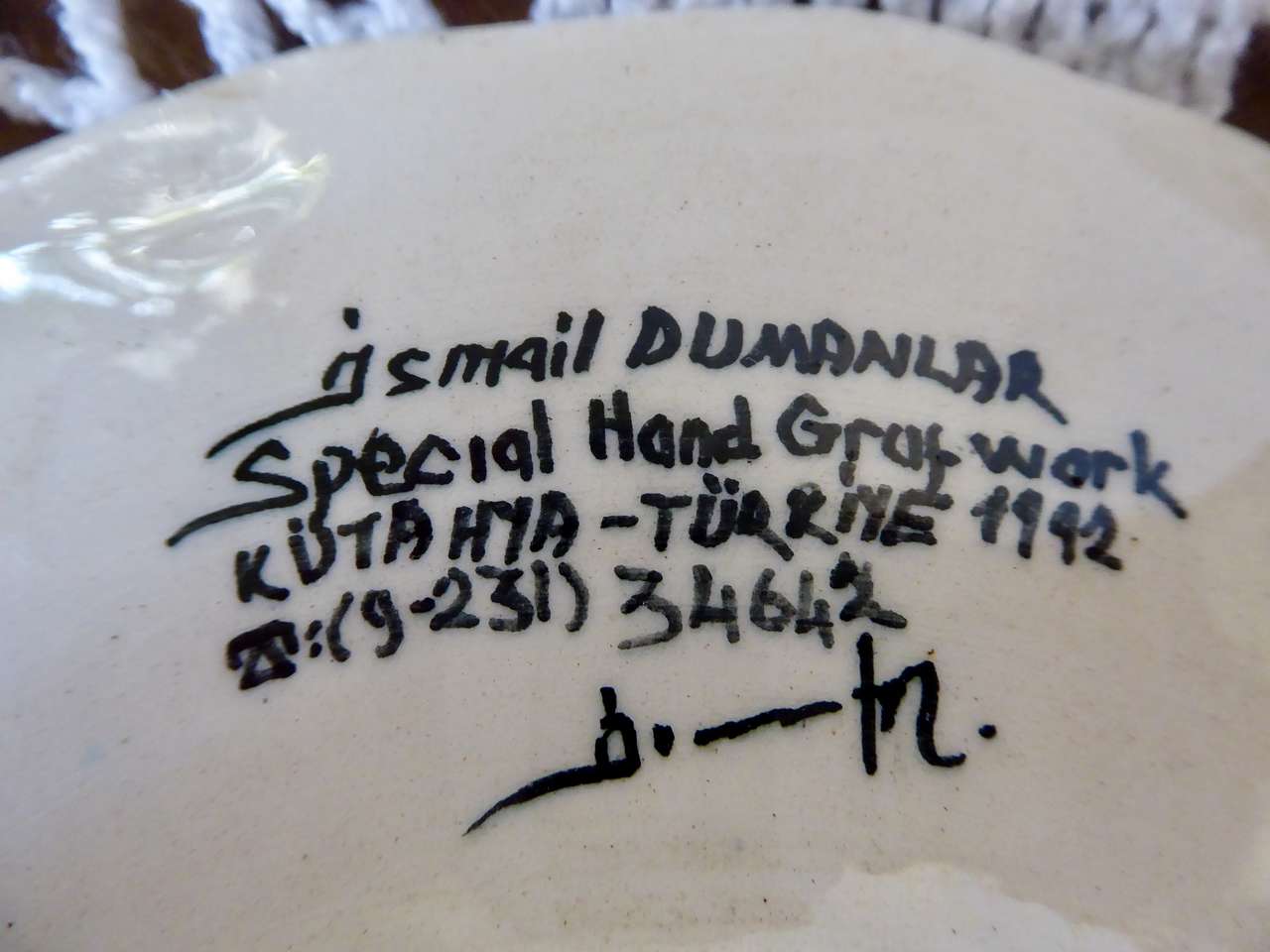 It Measures… 7 1/4 inches across. It is in very nice condition with no chips or cracks except for one small indention on the backside top area where it seems it was a little un smooth when it was made and fired in the kiln.