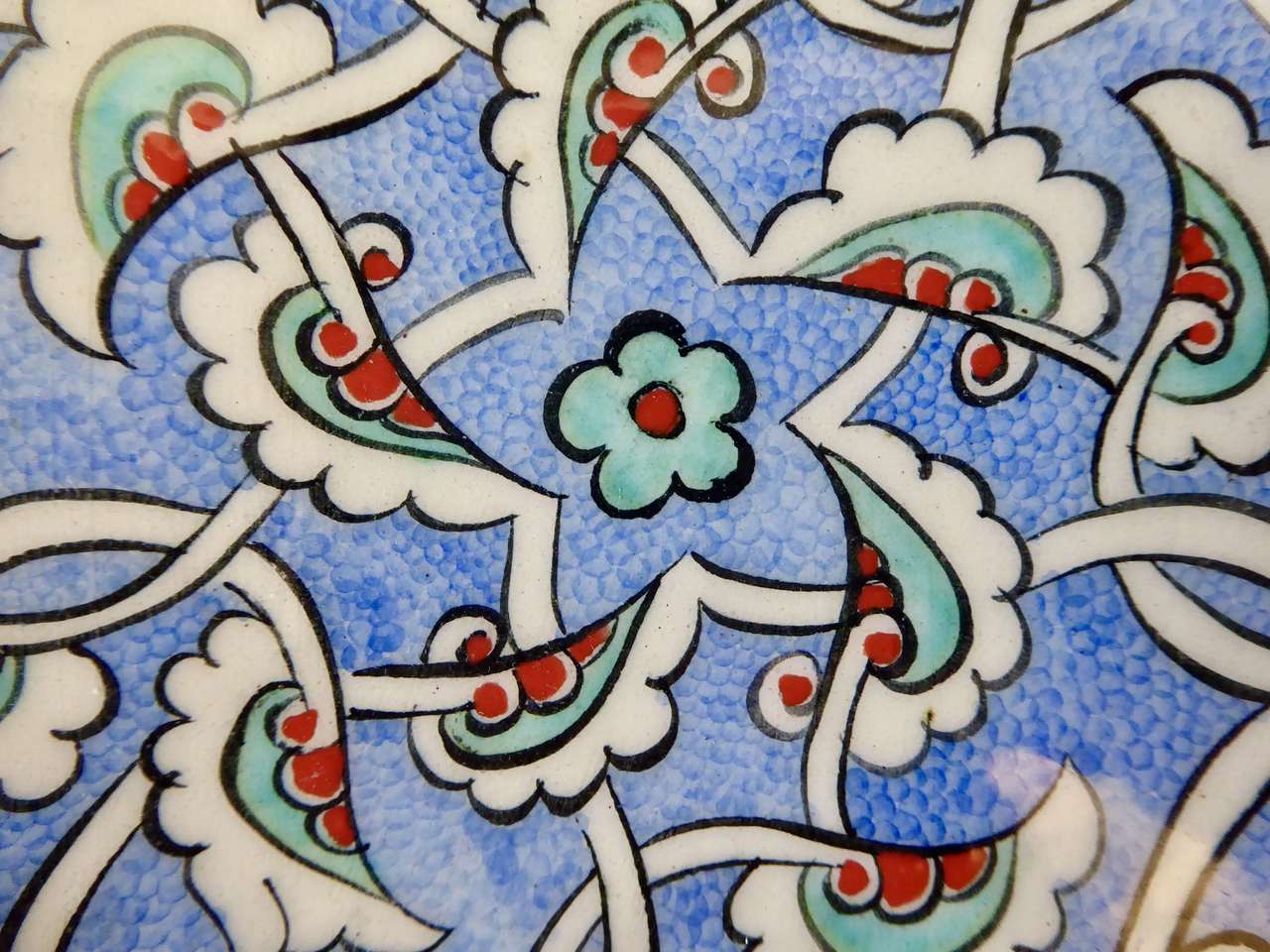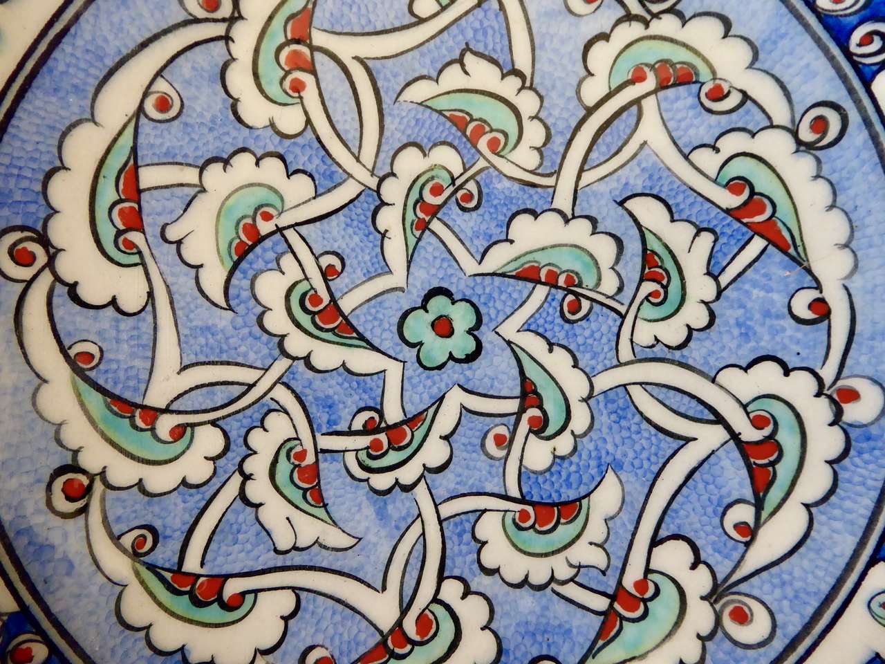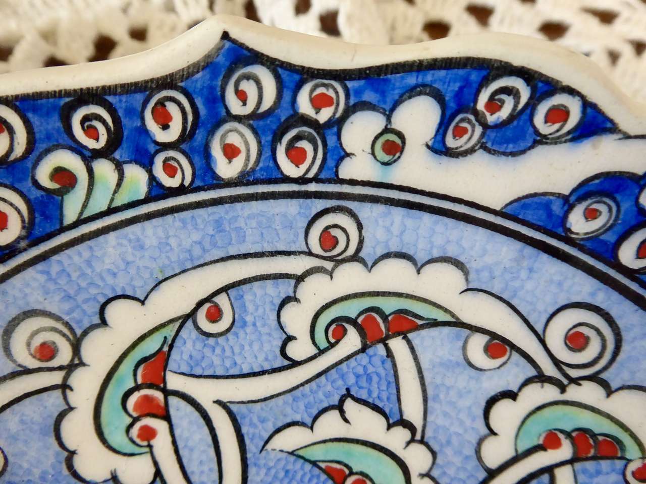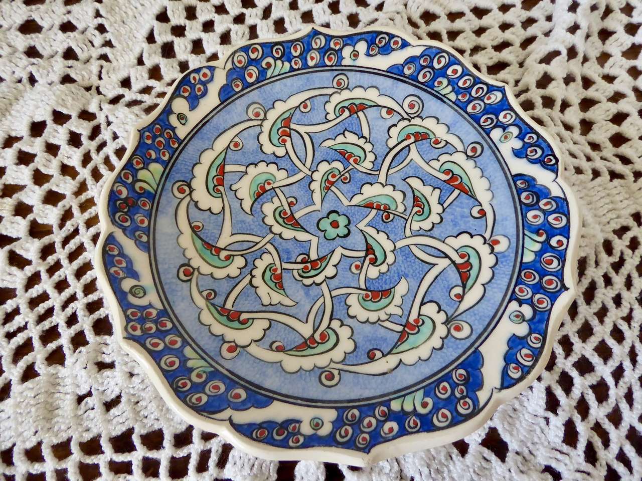 It Measures… 7 1/4 inches across. It is in very nice condition with no chips or cracks except for one small indention on the backside top area where it seems it was a little un smooth when it was made and fired in the kiln.