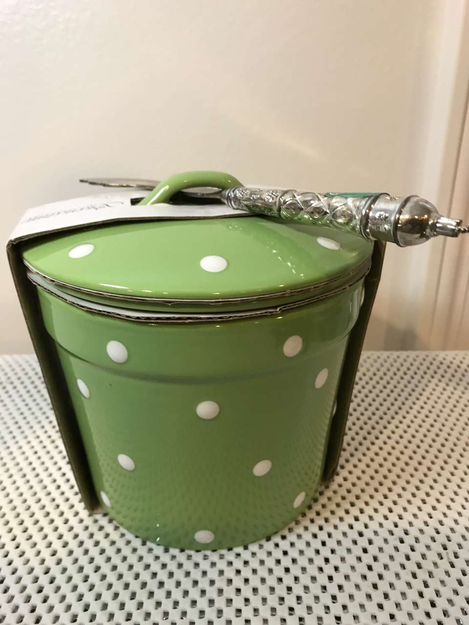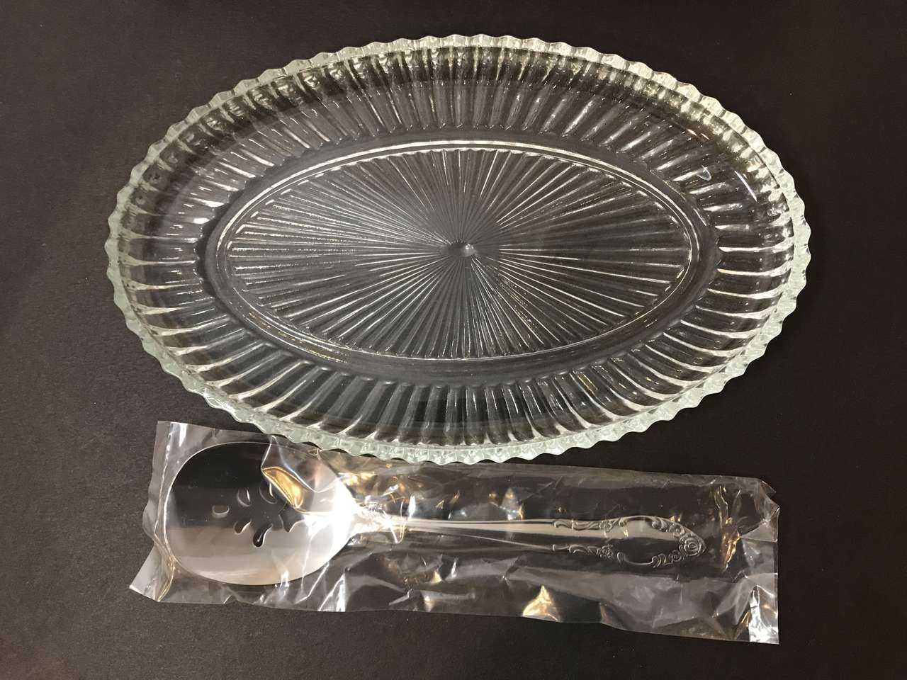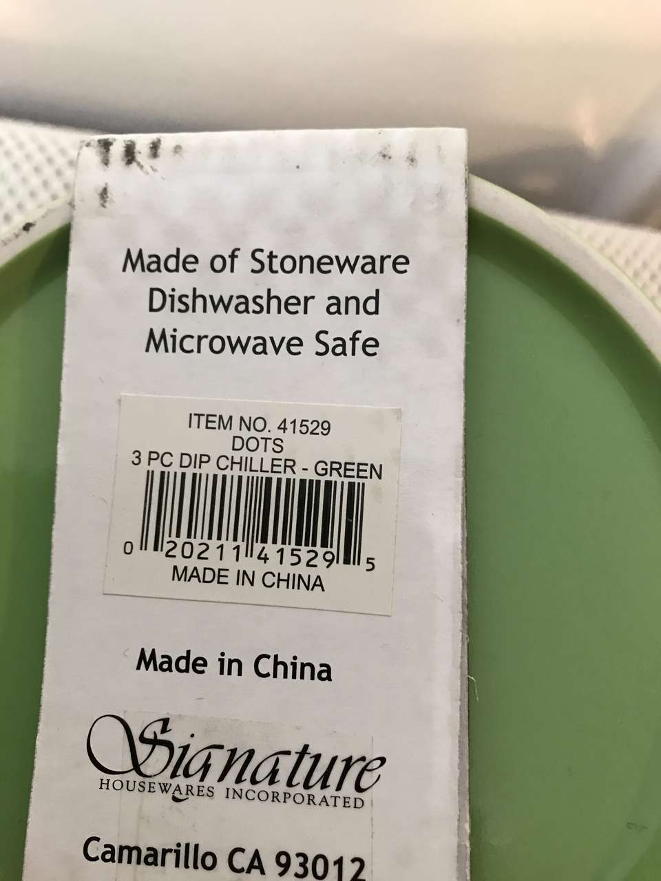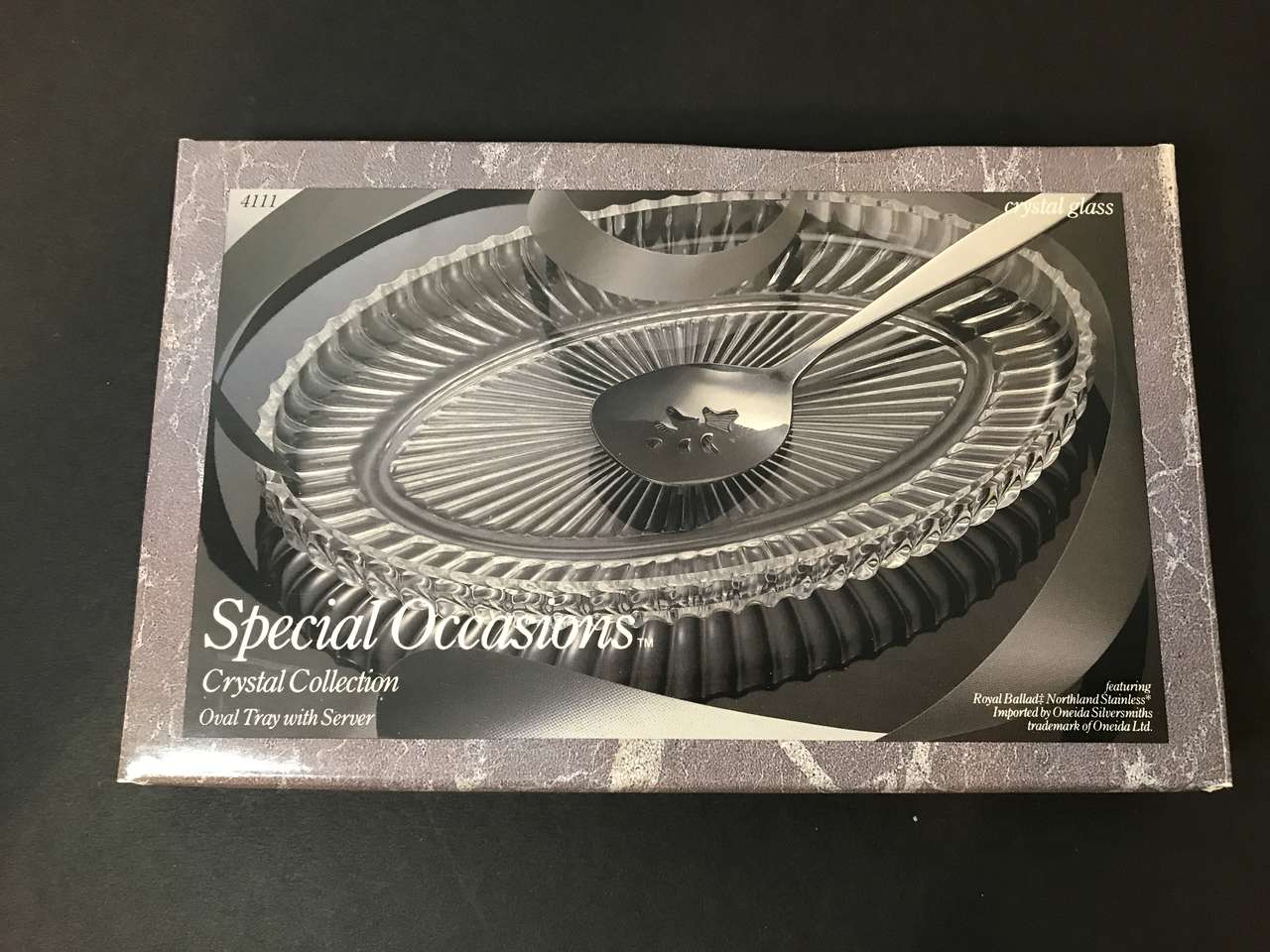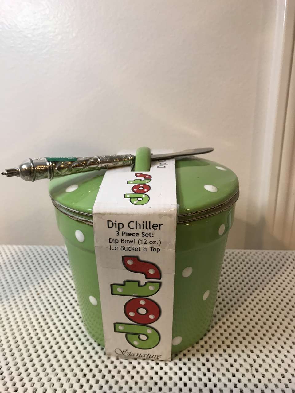 Dots Dip Chiller 3 piece Set - Dip Bowl (12 oz.), Ice Bucket & Top Made of Stoneware by Signature Housewares Inc. New condition. Also included is a Silver Spread Knife. Knife needs polished even though it has never been used. and Cherbourg Vintage French 24% Lead Crystal Wine Goblets 8 pieces, New, W M Dalton, Made in France, and Special Occasions Crystal Collection Oval Tray with Server, 8"x5", Oneida Silversmiths, New, all for $60.00