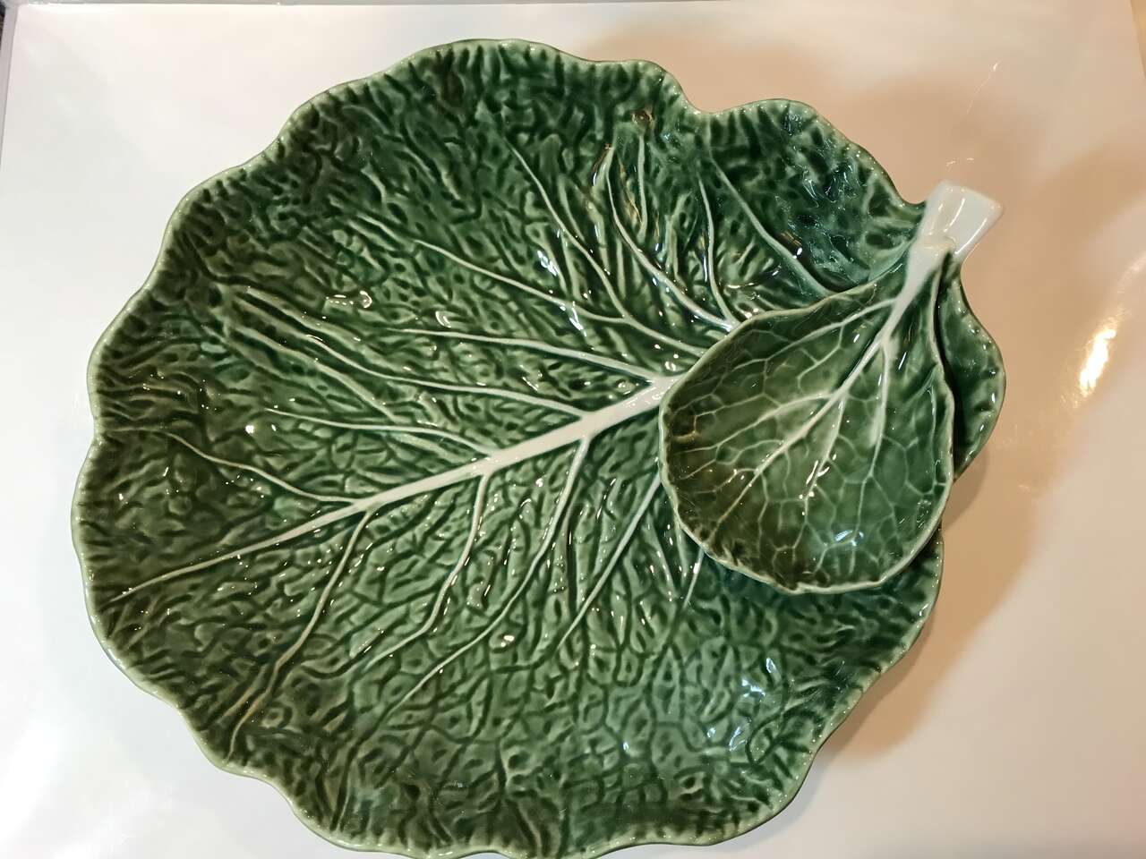 Majolica Bordallo Pinneiro L. Chip and Dip bowl made in Portugal. It is 13 1/2" x 11 1/2" x 3" and the inside bowl is 5" x 4" x 1". Rendered in rustic cabbage motif, this Majolica earthenware chip-and-dip bowl will make a gorgeous spring and summer entertaining dish at your table. $60.00