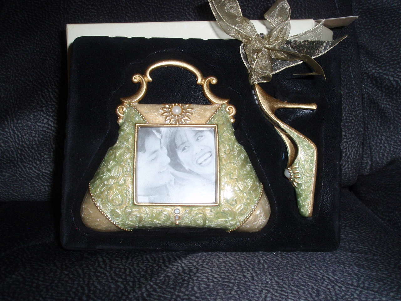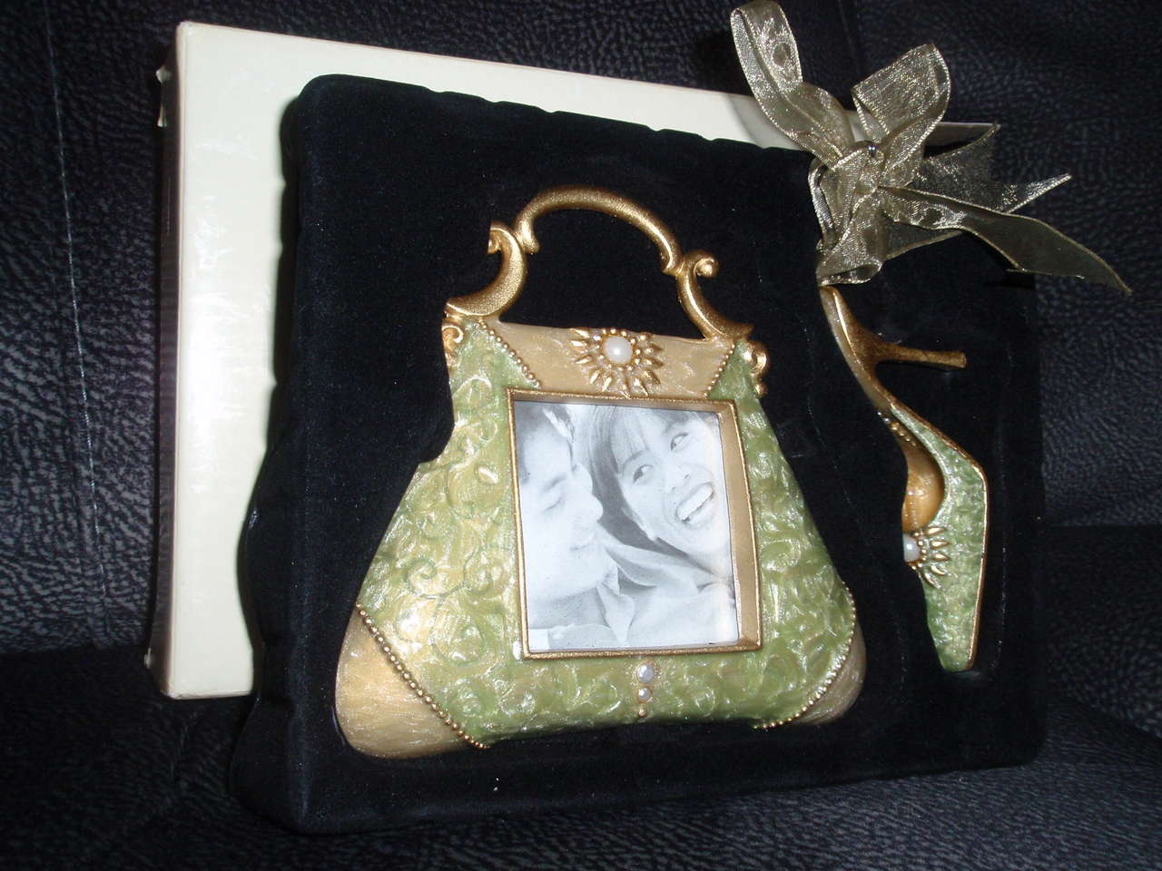 Jeweled porcelain purse picture frame and ornament set. Holds 2½ in. x 2½ in. photo. - NEW