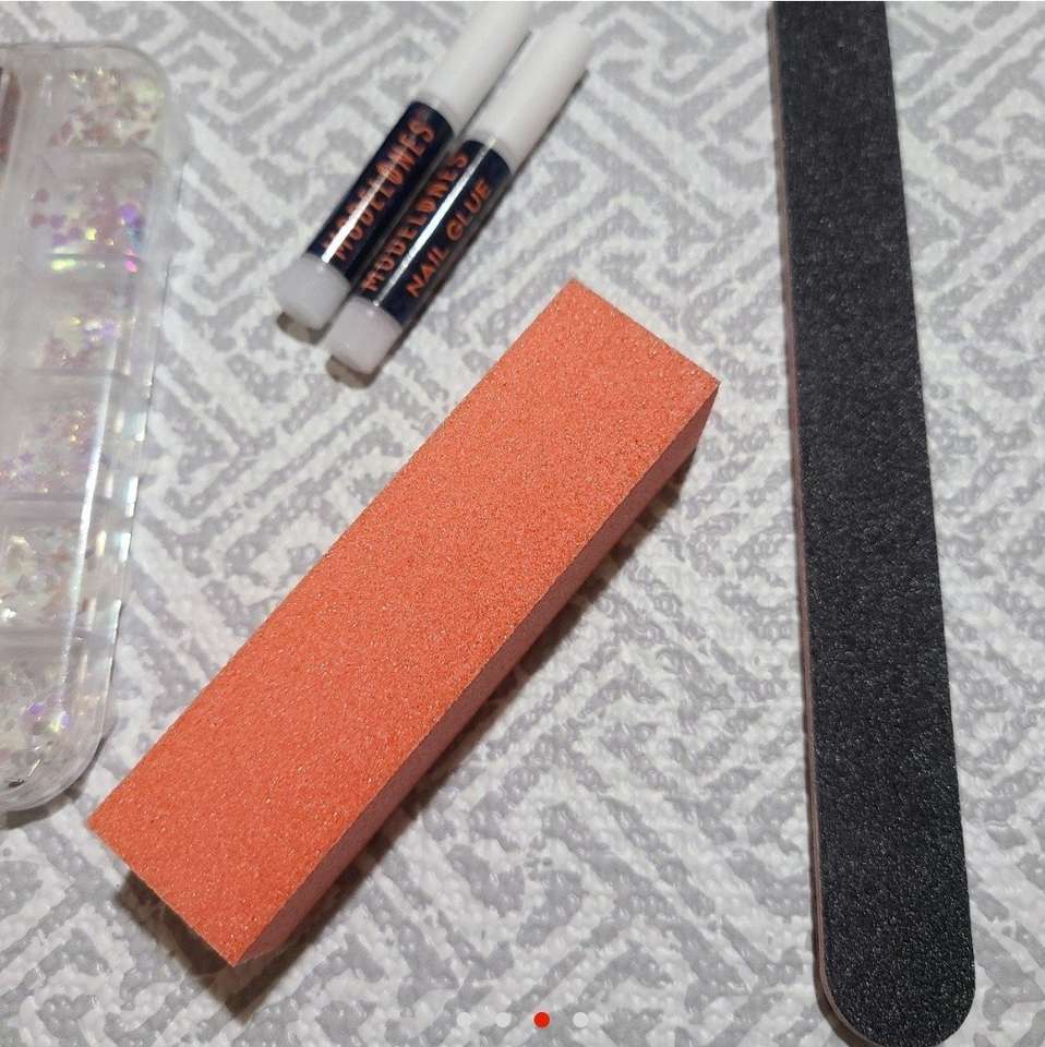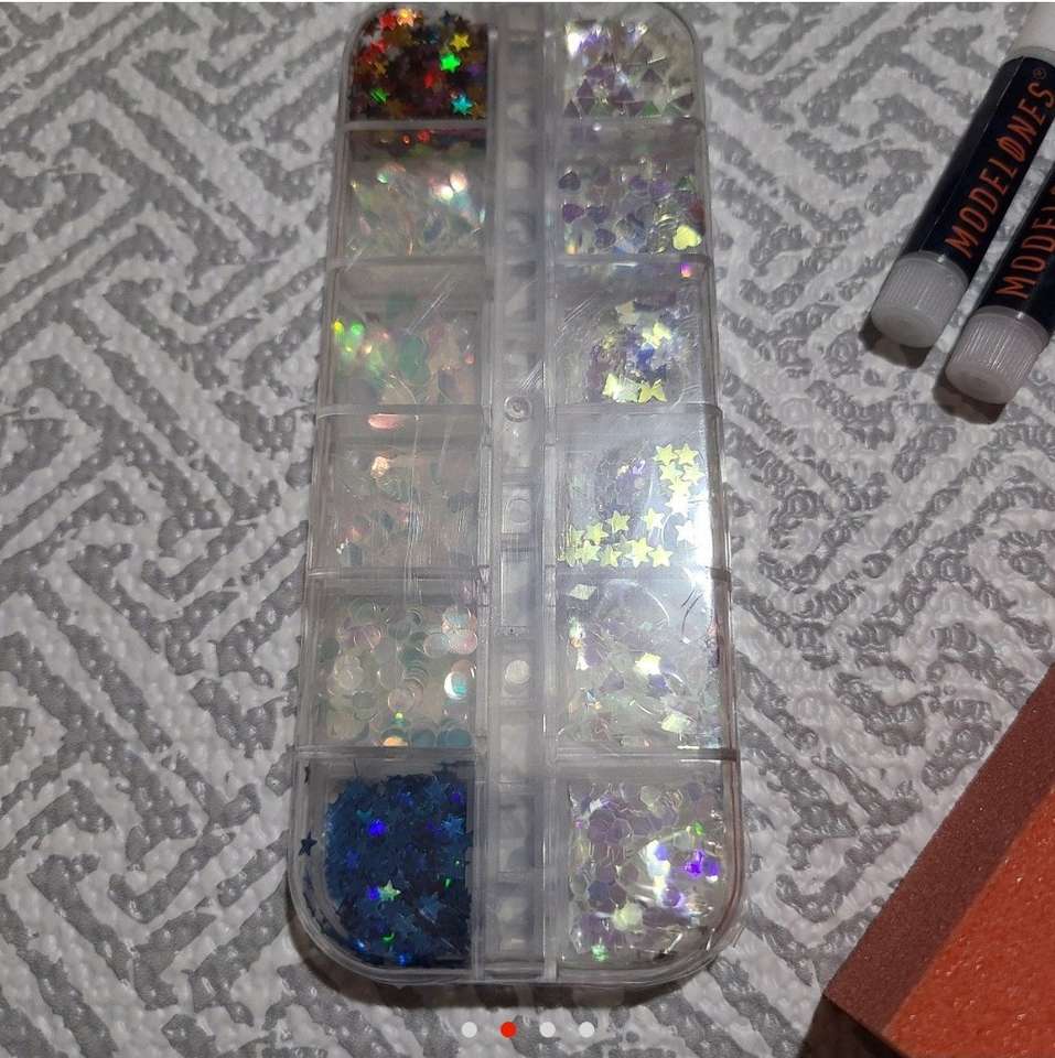 This listing of Modelones nail art supplies are all new never used. You get 1 container of butterfly, stars, hearts, hexagon, circles nail glitter sequins, 2 2g nail glue, 1 buffer, and 1 nail file 100/180 grit. These are all new never used. All my items come from a smoke free home. Any questions please feel free to contact me.