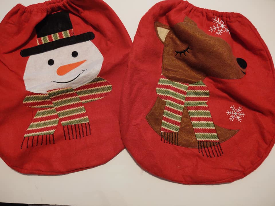 Christmas Toilet Seat Covers ..Standard Toilet Seat Cover size: 17.32" x 13.78" .. They can be thrown in the wash to keep them clean. ..Santa & Reindeer ..$6 ea or $10 Both