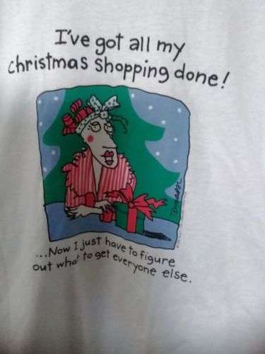 Christmas T-shirt ..Size: XL (Looks more like 1-2x) "I've got all my Christmas shopping done ..Now I just have to figure out what to get everyone else!" .. $3 (G) Brand New with tags