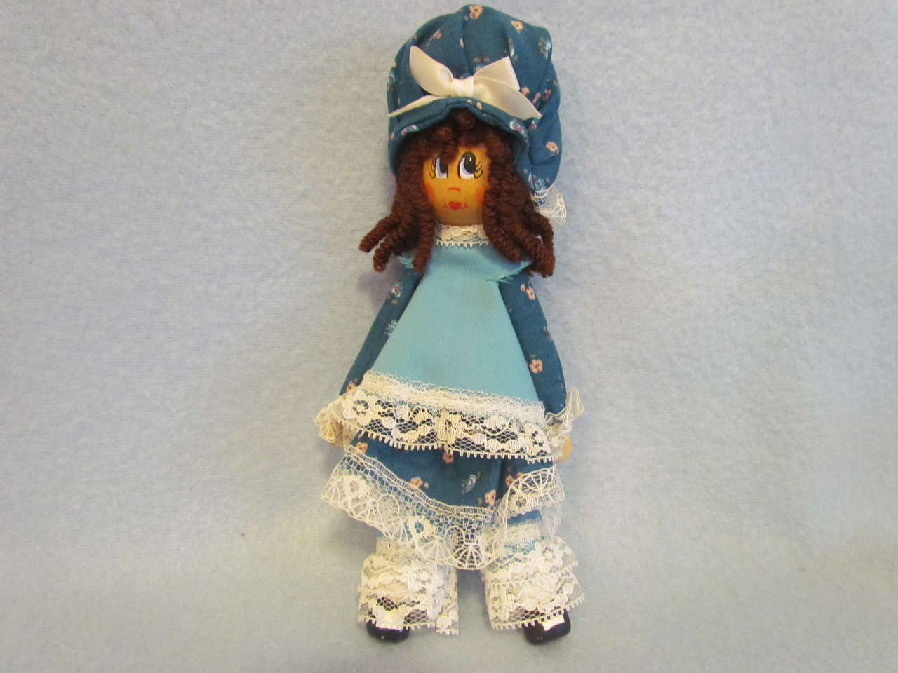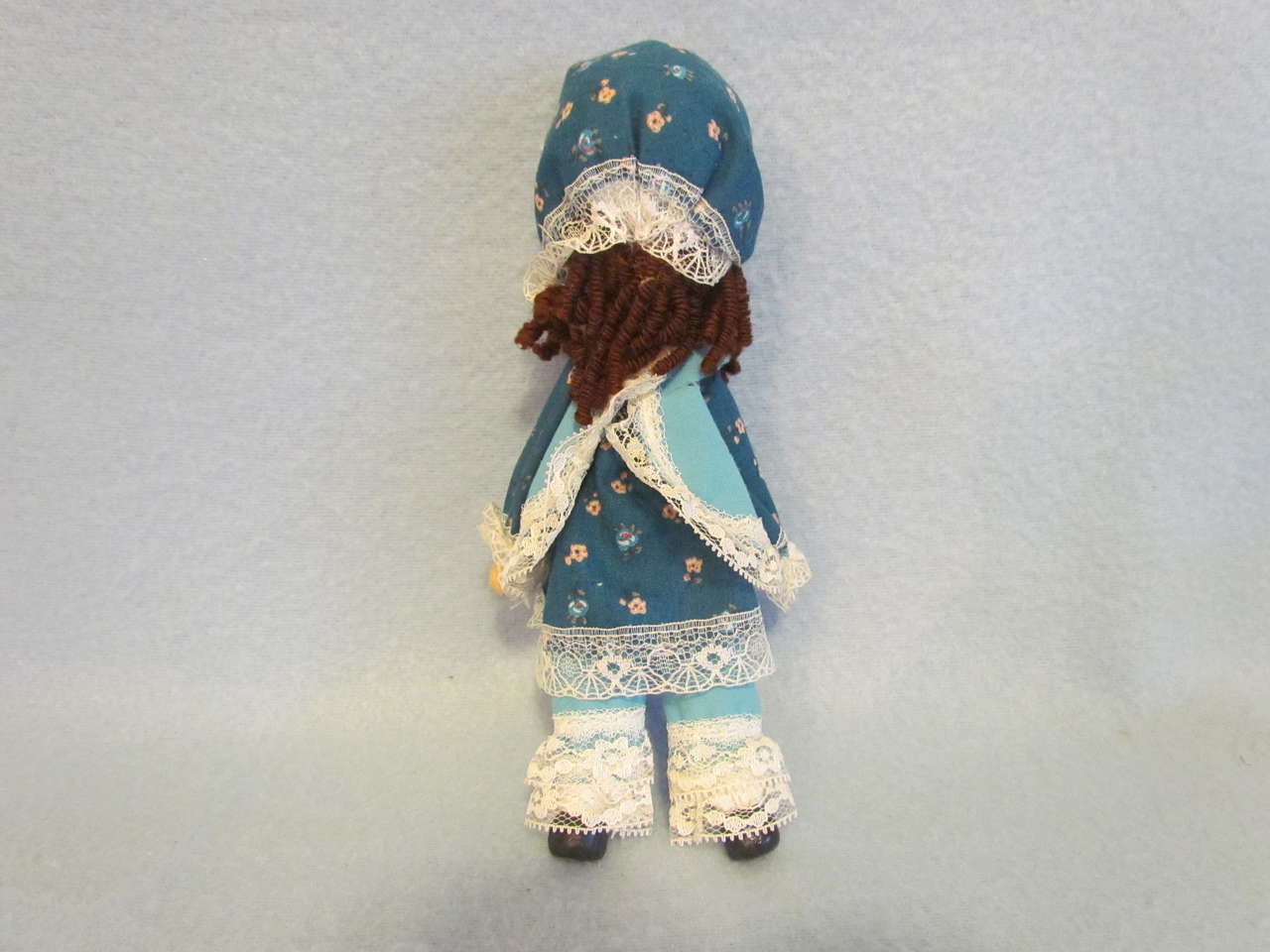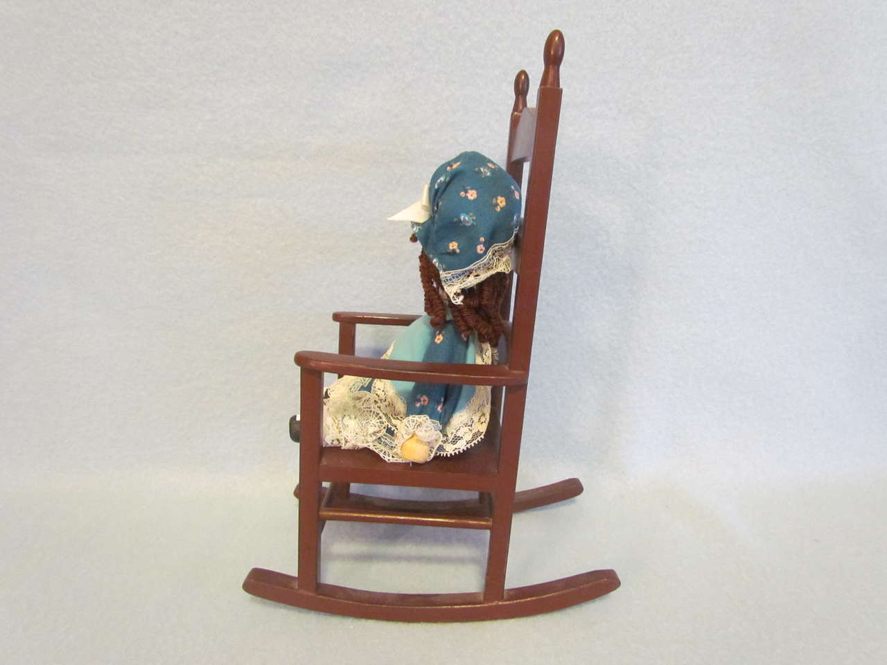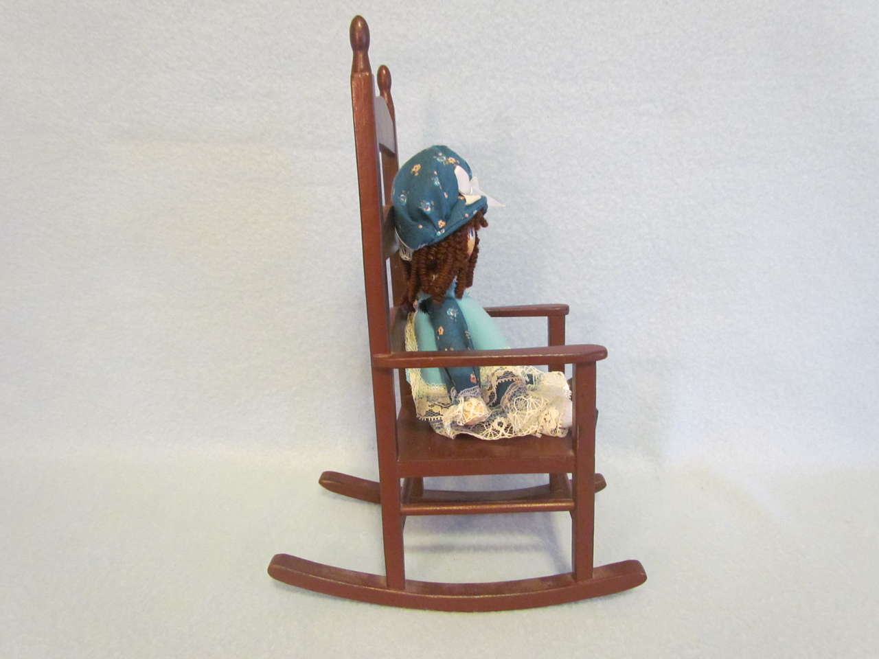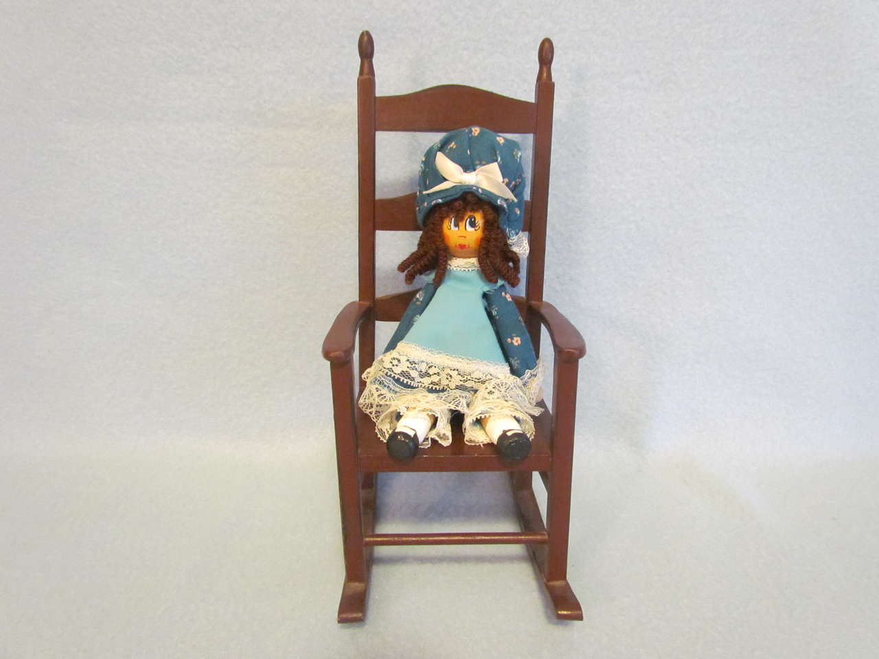 This lovely handmade doll & chair will delight anyone who enjoys “Edith Ann”. She has been gently played with and is still in very nice condition. She has a teal colored dress with matching bloomers and hat trimmed with lace; brown curly hair; a painted face, hands, and feet; and her arms and legs move. She is sitting on a wooden rocking chair made for dolls. Chair is in good condition - please see pictures.