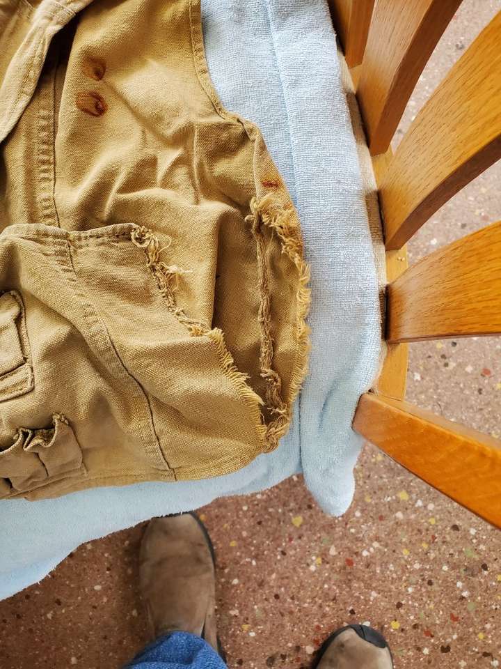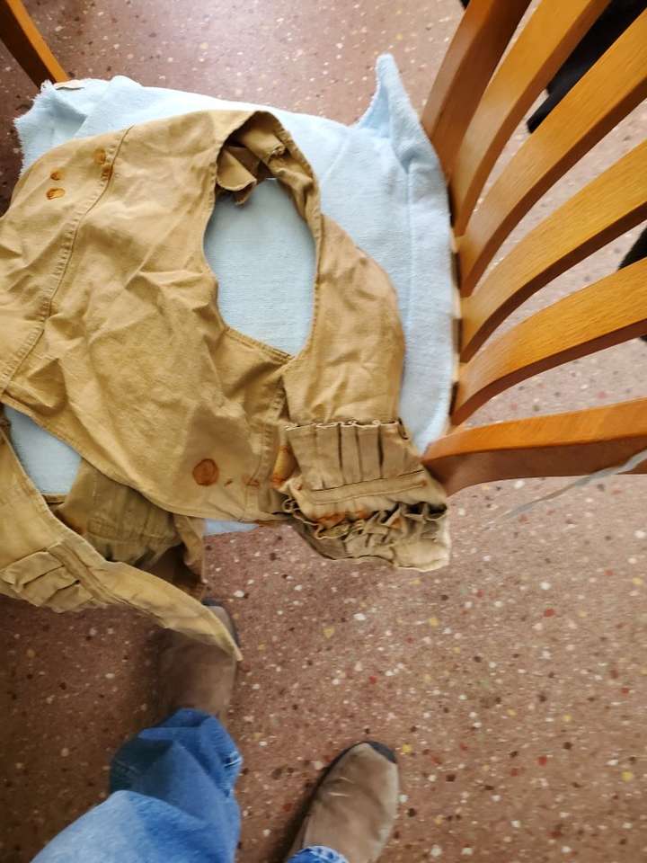 Hang this in your man cave. Vintage hunting canvas vest. It is tore on one side and has a lot of wear. I used this 40 years ago and have had it hanging around since. It was old and used when I got it. 25.00 CASH ONLY