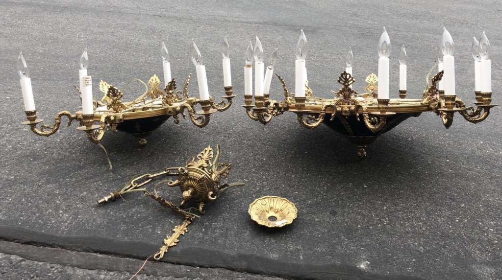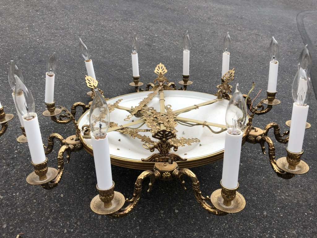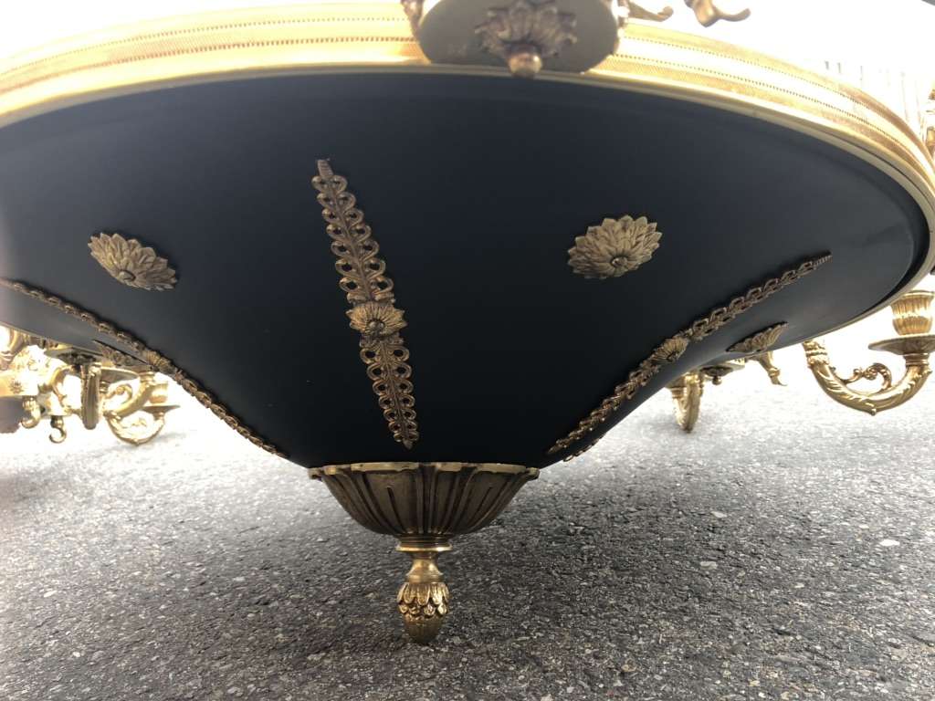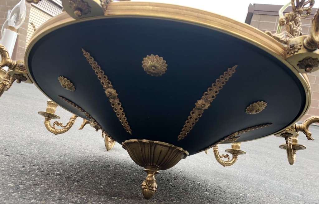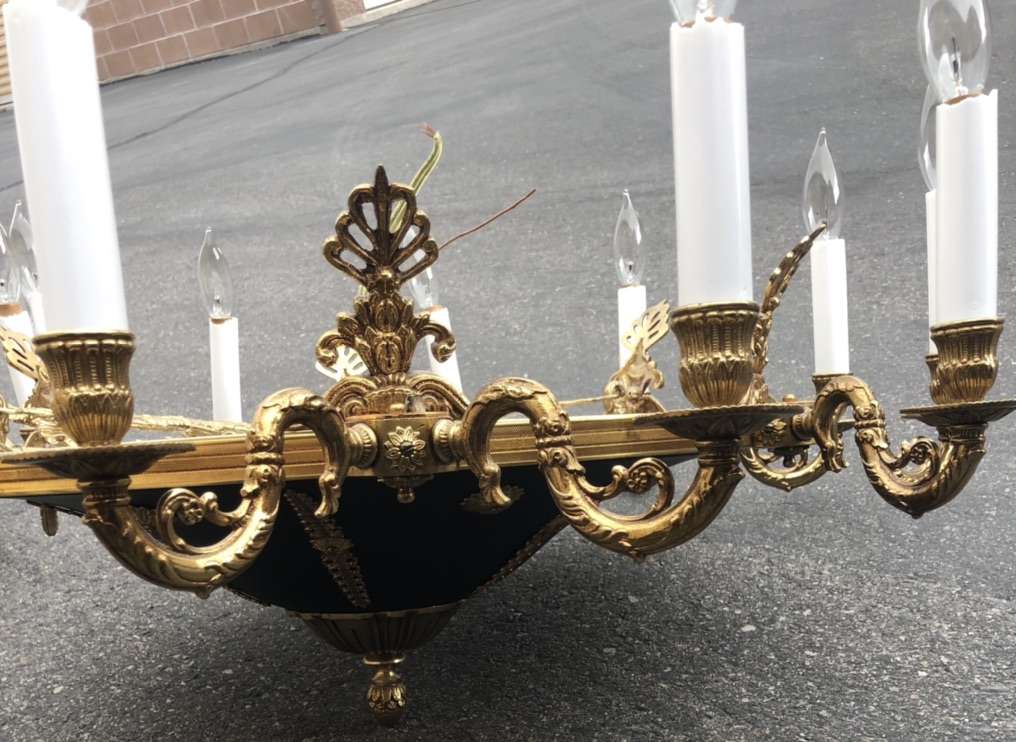 WOW! This jaw dropping beauty is massive masterpiece. Tiered bronze veritable 18 arms total with black. So much detail. It needs to be rewired as the wires were cut to take it down. It is in great condition. Some of the white tubes are chippy around the tops. You could easily have new ones made or order new ones. Maybe even flip them around so the chippy side is on the bottom and not seen. Each “bowl” also has a regular light bulb inside to add light and show off the chandelier. Lower tier diameter is 32.5”. Top tier is 27”.