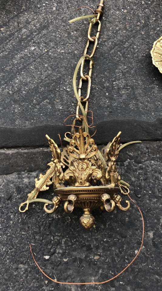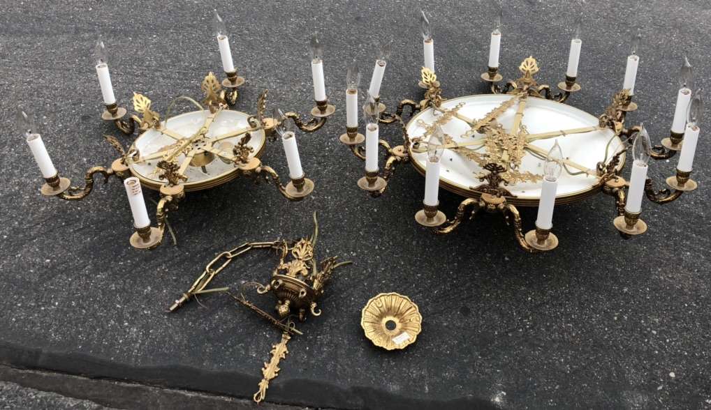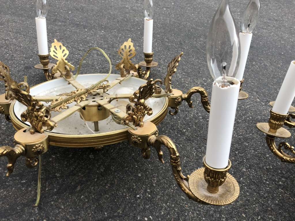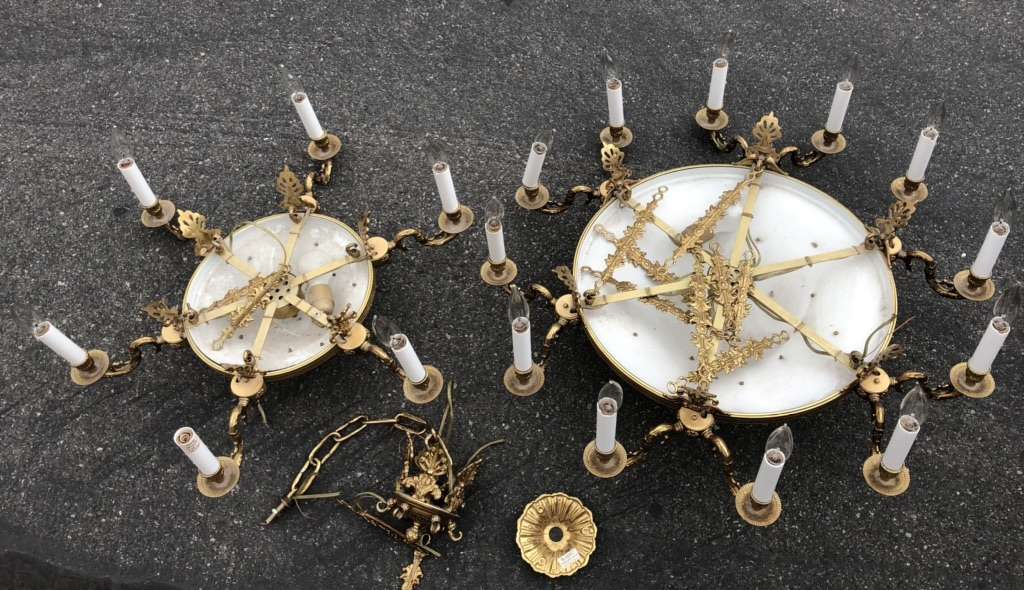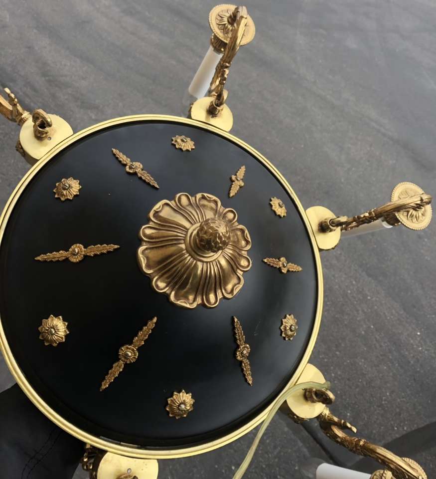 WOW! This jaw dropping beauty is massive masterpiece. Tiered bronze veritable 18 arms total with black. So much detail. It needs to be rewired as the wires were cut to take it down. It is in great condition. Some of the white tubes are chippy around the tops. You could easily have new ones made or order new ones. Maybe even flip them around so the chippy side is on the bottom and not seen. Each “bowl” also has a regular light bulb inside to add light and show off the chandelier. Lower tier diameter is 32.5”. Top tier is 27”.