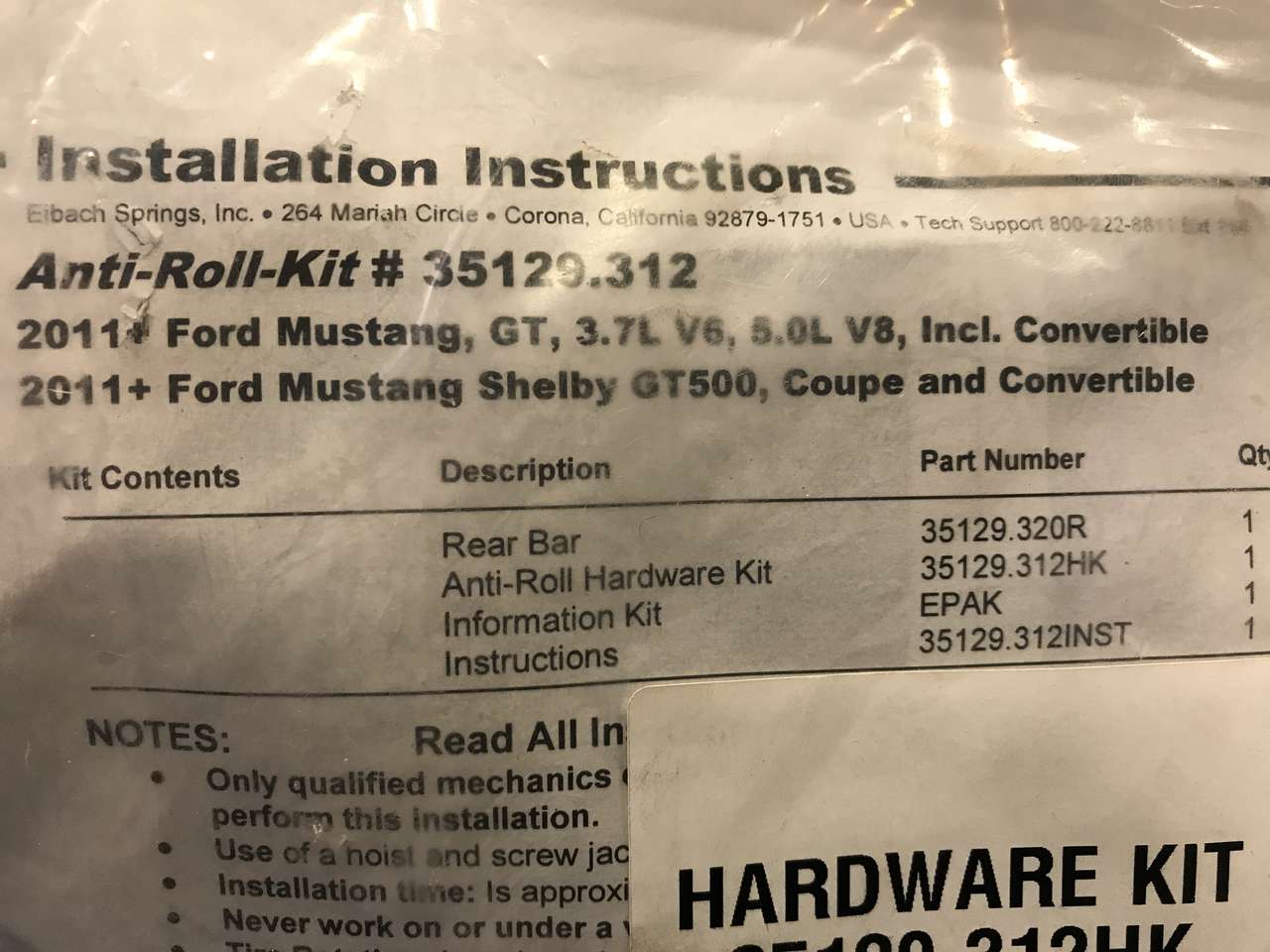 VenmoEIBACH ANTI-ROLL KIT #35129.312HK for 2011+ Ford Mustang, GT, 3.7L V6, 5.0L V8, including convertible and for 2011+ Ford Mustang Shelby GT 500, Coupe and Convertible. New in package. Original Value $163. Only $20. Ordered in error and can't use. In Sandy. 801-201-5350.